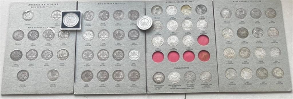 DECEASED ESTATE COMPLETE SET OF AUSTRALIA SILVER CROWN AND FLORIN COIN ALBUMS ALL DATE FROM FEDERATION-AUSTRALIAN SET OF 61 SILVER COINS FROM:1910 -1963 INC OF 1932 & 34/35 FINE TO GEM UNCIRCULATED TOTAL 61 COINS INCLUSIVE OF 1937 & 1938 CROWN COIN VALUE OVER $16,895 (AUSTRALIAN COINS & BANKNOTES SEVENTEENTH EDITION BY GREG MCDONALD 2010 PAGE) 795-102) 311073+2