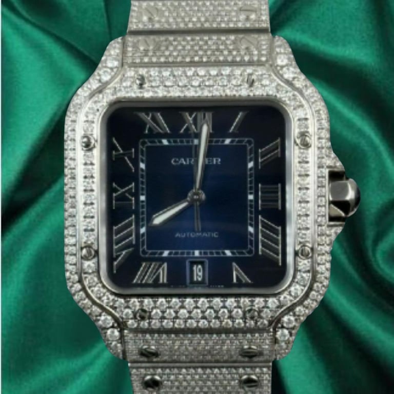 SANTOS DE CARTIER LARGE - CUSTOM DIAMOND NATURAL 2023 BXP WSSA0030 Brand: Cartier Model Number: SANTOS Reference Number: WSA0030 Production Year: 2023 Dial: BLUE Case: STAINLESS STEEL Case Size: 40MM Bracelet: STAINLESS STEEL Movement: AUTOMATIC Aftermarked Diamonds On Case And BraceletBox: YesPapers: Yes Condition: Good - Refer to Images