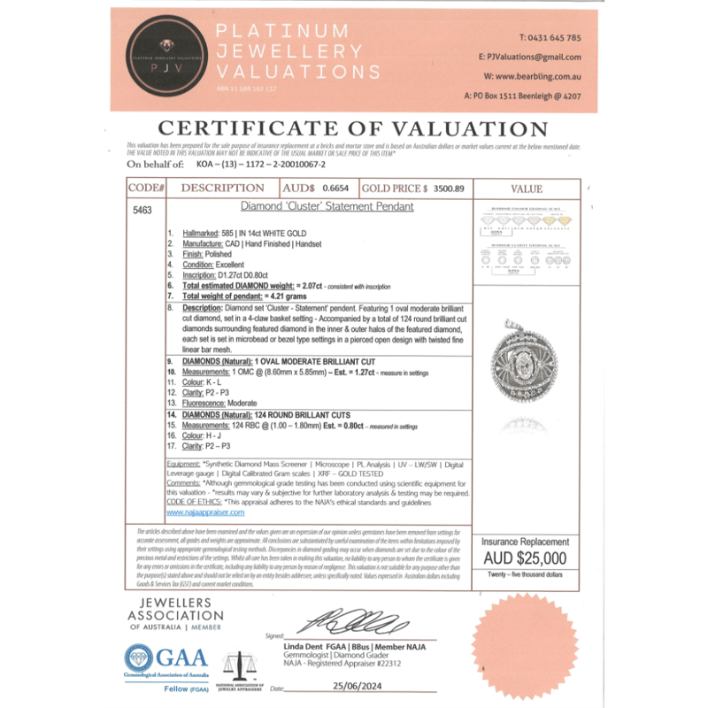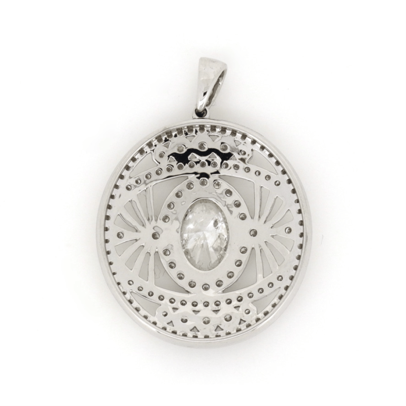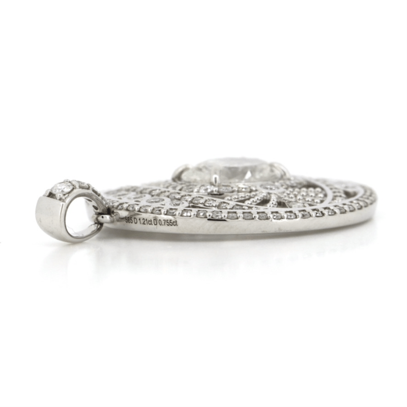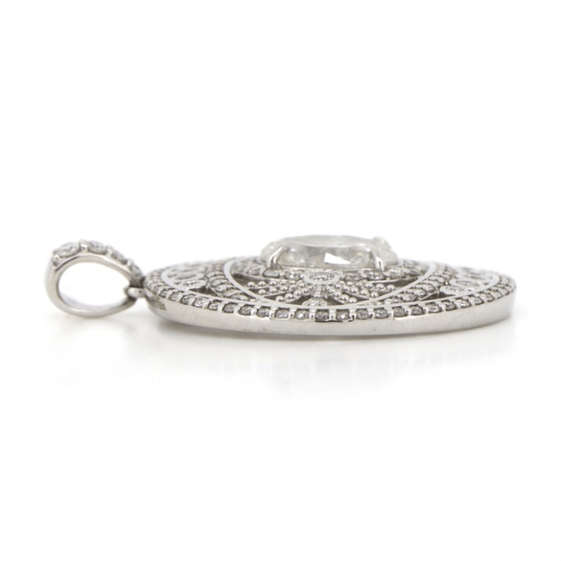 14K WHITE GOLD AND DIAMOND, DECORATIVE PENDANT. The Centre Features, One Oval Brilliant Cut, Diamond (1.27Ct, K-L Colour, P2-P3 Clarity), 4 Claw Set. Encompassing The Design Are, 124 Round Brilliant Cut, Diamonds (0.80Ct Tdw, H-J Colour, P2-P3 Clarity), Micro-Bead/Bezel Set. Total Weight Of Pendant Is 4.21G. Valuations Provided by an Independent Third-Party Professional Not Directly Associated With Lloyds Auctions at AUD $$25,000.00This valuation has been conducted by an independent third-party professional. The valuation amount is an assessment by the issuing valuer and does not reflect the auction value of the item. Any inquiries regarding the valuation should be directed to the issuing valuer (refer to contact details on the certificate), as Lloyds Auctions has no affiliation or influence over the valuation, the valuer, or the stated amount. Condition: Good - Refer Images 0645842+3104
