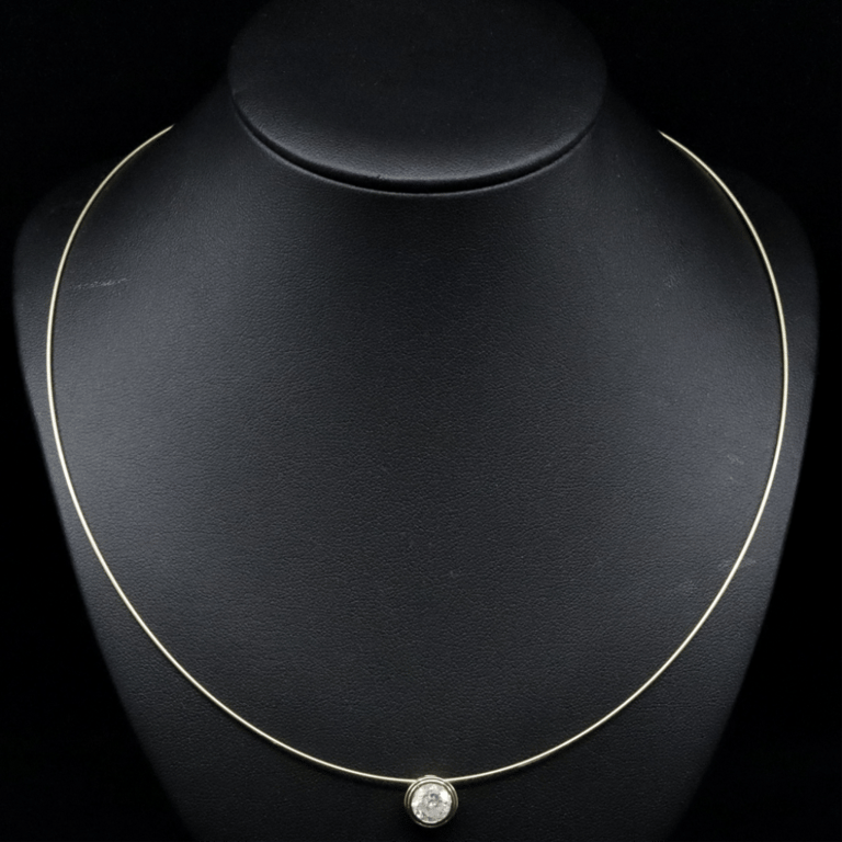 The Necklace Features, One Round Brilliant Cut, Diamond (1.59Ct Tdw, G-H Colour, P1-P2 Clarity), Bezel Set. The Omega Collar Style Chain Features A Concealed Spin Clip Clasp. Chain Length Is 45Cm.