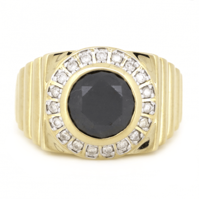 14K YELLOW GOLD, BLACK DIAMOND, GENTS RING. The Centre Features, One Round Brilliant Cut, Black, Diamond (2.36Ct, Opaque), Bezel Set. Surrounding The Centre In A Halo Are, 19 Round Brilliant Cut, Diamonds (0.21Ct Tdw, H-I Colour, Si Clarity), Micro-Bead Set. Ring Size M. Valuations Provided by an Independent Third-Party Professional Not Directly Associated With Lloyds Auctions at AUD $$16,800.00This valuation has been conducted by an independent third-party professional. The valuation amount is an assessment by the issuing valuer and does not reflect the auction value of the item. Any inquiries regarding the valuation should be directed to the issuing valuer (refer to contact details on the certificate), as Lloyds Auctions has no affiliation or influence over the valuation, the valuer, or the stated amount. Condition: Good - Refer Images 0645848+3263