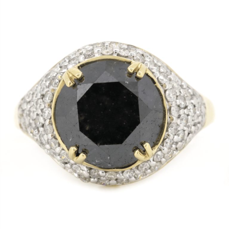 The Centre Features, One Round Cut, Black, Diamond (5.47Ct, Opaque), Double Claw Set. Encompassing The Centre Are, 70 Round Brilliant Cut, Diamonds (0.67Ct Tdw, J-K Colour, Si1-I2 Clarity), Pave Set In White Gold. Ring Size P.