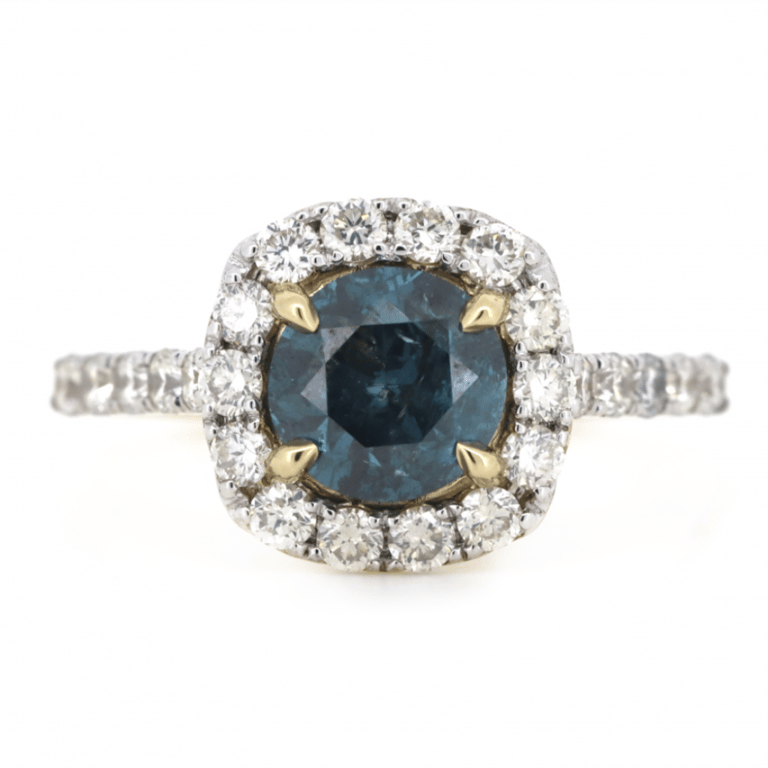 14K YELLOW GOLD, BLUE DIAMOND AND DIAMOND, HALO RING. The Centre Features One, Round Brilliant Cut, Teal Moderate Blue, Diamond (1.03Ct, P3+ Clarity, Irradiated), 4 Claw Set. Surrounding The Centre In A Halo And Decorating The Band Are, 24 Round Brilliant Cut Diamonds (0.55Ct Tdw, H-K Colour, P2+ Clarity), Bead Set. Ring Size J. Valuations Provided by an Independent Third-Party Professional Not Directly Associated With Lloyds Auctions at AUD $$16,400.00This valuation has been conducted by an independent third-party professional. The valuation amount is an assessment by the issuing valuer and does not reflect the auction value of the item. Any inquiries regarding the valuation should be directed to the issuing valuer (refer to contact details on the certificate), as Lloyds Auctions has no affiliation or influence over the valuation, the valuer, or the stated amount. Condition: Good - Refer Images 0645848+3238