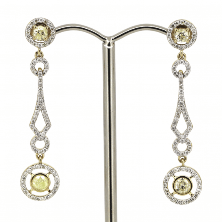 14K YELLOW GOLD, FANCY YELLOW DIAMOND, ART DECO INSPIRED DROP EARRINGS. The Design Features, 4 Round Brilliant Cut, Light Fancy Yellow, Diamonds (0.61Ct Tdw, P2+ Clarity), Bezel Set. Encompassing The Design Are, 146 Round Brilliant Cut, Diamonds (0.732Ct Tdw, H-K Colour, P2+ Clarity), Bead Set. The Earrings Have Post Backs, With 14K Yellow Gold Butterfly Clasps. Valuations Provided by an Independent Third-Party Professional Not Directly Associated With Lloyds Auctions at AUD $$13,400.00This valuation has been conducted by an independent third-party professional. The valuation amount is an assessment by the issuing valuer and does not reflect the auction value of the item. Any inquiries regarding the valuation should be directed to the issuing valuer (refer to contact details on the certificate), as Lloyds Auctions has no affiliation or influence over the valuation, the valuer, or the stated amount. Condition: Good - Refer Images 0645848+3215
