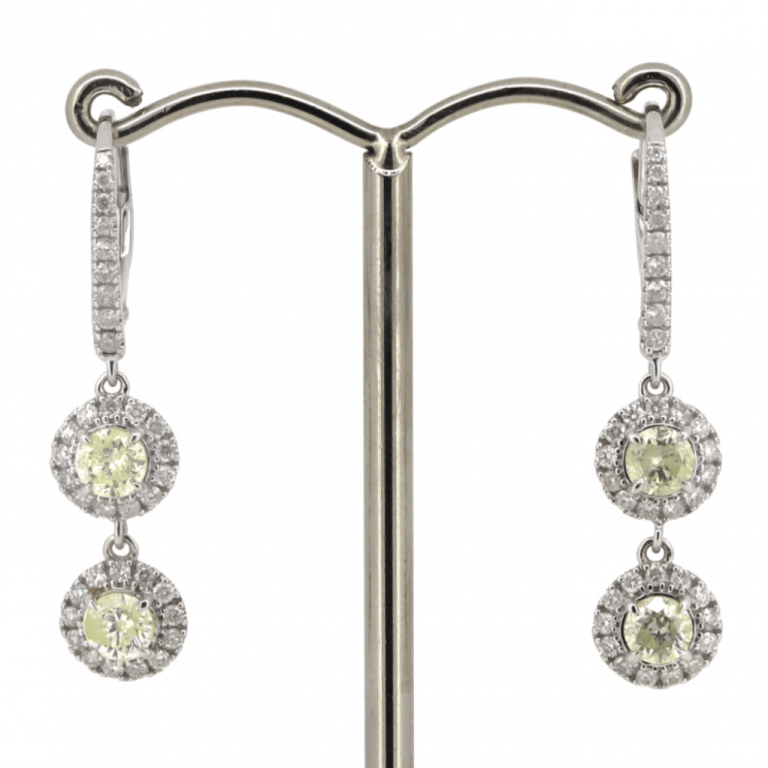 14K WHITE GOLD, FANCY YELLOW DIAMOND, DOUBLE DROP EARRINGS.