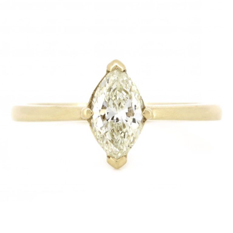 The Centre Features, One Marquise Modified Cut, Fancy Yellow, Diamond (0.71Ct, P2 Clarity), 4 Claw Set. Ring Size M.