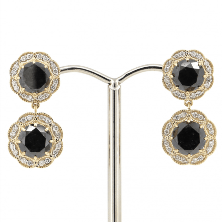 The Drops Feature, 4 Round Brilliant Cut, Black Diamonds (7.57Ct Tdw, Opaque), Claw Set. Surrounding The Centres In Floral-Style Halos Are, 64 Round Brilliant Cut Diamonds (0.42Ct Tdw, H Colour, Si Clarity), Bead Set With Millegrain Detail. The Earrings Have Post Backs, With 14K Yellow Gold Butterfly Clasps.