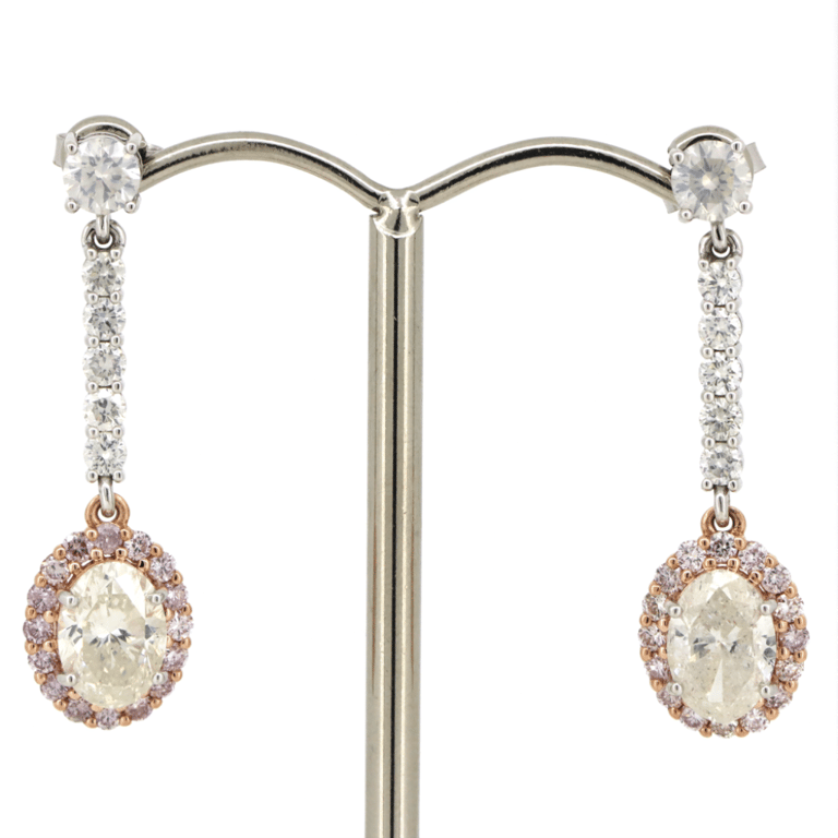 The Design Features, 2 Oval Brilliant Cut, Diamonds (2.42Ct Tdw, H-J Colour, Si1-I2 Clarity), 4 Claw Set. Encompassing The Centre Are, 32 Round Brilliant Cut, Fancy Purplish-Pink, Diamonds (0.56Ct Tdw, Vs-Si Clarity), Claw Set. Decorating The Studs And Drops Are, 12 Round Brilliant Cut, Diamonds (1.13Ct Tdw, H-J Colour, Si Clarity), Claw Set. The Earrings Have 14K White Gold Butterfly Clasps.