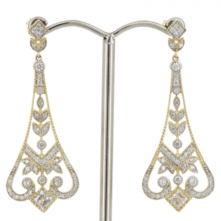 The Design Features, 2 Princess Cut, Diamonds (0.74Ct Tdw, G-H Colour, Si1-Si2 Clarity), Bezel Set With Millegrain Detail. Decorating The Design Are, 94 Round Brilliant Cut, Diamonds (0.832Ct Tdw, G-H Colour, Si1-Si2 Clarity), Bead Set With Millegrain Detail. The Earrings Have Post Backs, With 14K Yellow Gold Butterfly Clasps.