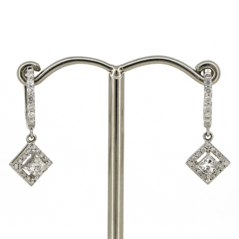 The Centres Feature, 2 Princess Cut, Diamonds (0.40Ct Tdw, G-H Colour, P1-P2 Clarity), 4 Claw Set. Surrounding The Centres In Halos And Decorating The Front Of The Hooks Are, 46 Round Brilliant Cut, Diamonds (0.32Ct Tdw, H-J Colour, Si2-P2 Clarity), Claw Set. The Earrings Have Latch Back Closures.