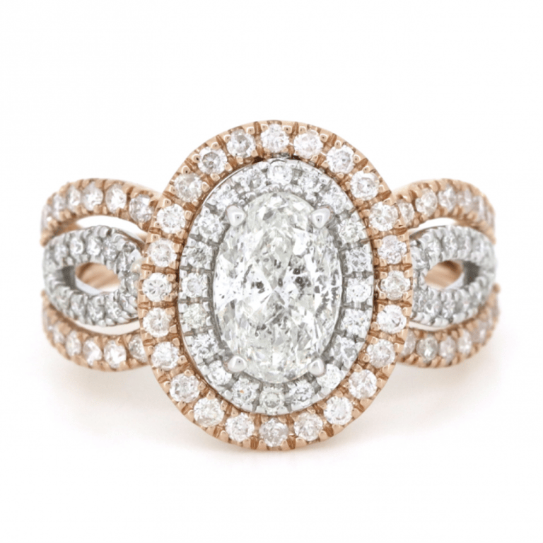 14K ROSE/WHITE GOLD AND DIAMOND, DOUBLE HALO RING.
