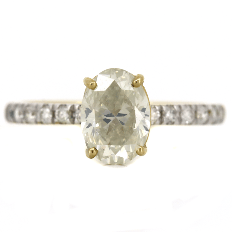 The Centre Features, One Oval Brilliant Cut, Diamond (1.41Ct, I-J Colour, Si1 Clarity), 4 Claw Set. Decorating The Band Are, 16 Round Brilliant Cut, Diamonds (0.24Ct Tdw, H Colour, Si-I1 Clarity), Claw Set. Ring Size M.