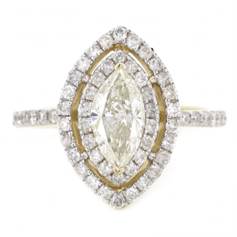 The Centre Features, One Marquise Brilliant Cut, Diamond (0.93Ct, J-K Colour, P2 Clarity), Claw Set. Surrounding The Centre In A Double Halo And Decorating The Band Are, 56 Round Brilliant Cut, Diamonds (0.62Ct Tdw, H-J Colour, Si2-P2 Clarity), Claw Set. Ring Size M.