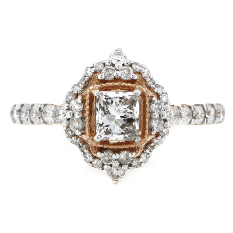 14K ROSE GOLD AND DIAMOND, VINTAGE INSPIRED RING. The Centre Features, One Princess Cut, Diamond (0.69Ct, G-H Colour, P2 Clarity), Claw Set. Surrounding The Centre In A Decorative Halo And Along The Band Are, 42 Round Brilliant Cut, Diamonds (0.55Ct Tdw, H-J Colour, Si2-P2 Clarity), Claw Set With Millegrain Detail. Ring Size M. Valuations Provided by an Independent Third-Party Professional Not Directly Associated With Lloyds Auctions at AUD $$14,960.00This valuation has been conducted by an independent third-party professional. The valuation amount is an assessment by the issuing valuer and does not reflect the auction value of the item. Any inquiries regarding the valuation should be directed to the issuing valuer (refer to contact details on the certificate), as Lloyds Auctions has no affiliation or influence over the valuation, the valuer, or the stated amount. Condition: Good - Refer Images 0645848+3273