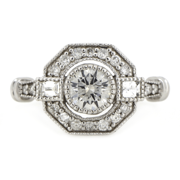 The Centre Features, One Round Brilliant Cut, Diamond (0.53Ct, H Colour, Si1 Clarity), Bezel Set With Millegrain Detail. Flanked By, 2 Baguette Cut, Diamonds (0.09Ct Tdw, G Colour, Si Clarity), Bezel Set With Millegrain Detail. Surrounding The Centre And Decorating The Band Are, 18 Round Brilliant Cut, Diamonds (0.216Ct Tdw, H Colour, Si-I1 Clarity), Bead Set In White Gold With Millegrain Detail. Ring Size M.