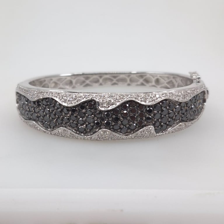 18CT WHITE GOLD 202 STONE DIAMOND BANGLE 105 Round Brilliant Cut Treated Colour Black Di Rhodium Plated Grain Set In Wavey Edge Centre With 46 & 51 Round Brilliant Cut Diamonds Outer Edges In A 1/4 Round Hollowed Out 15.16.35Mm Tapered Oval Bangle With Concea 2 Figure Of 8 Safety Catches. Total Item Weight: 51.61g Condition: Good - Refer To Images This valuation has been conducted by an independent third-party professional. The valuation amount is an assessment by the issuing valuer and does not reflect the auction value of the item. Any inquiries regarding the valuation should be directed to the issuing valuer (refer to contact details on the certificate), as Lloyds Auctions has no affiliation or influence over the valuation, the valuer, or the stated amount. Insurance Replacement Valuation Amount: $15,050.00 VAULT 586154+1