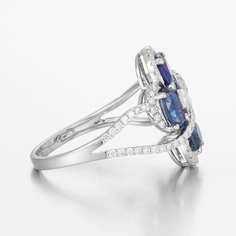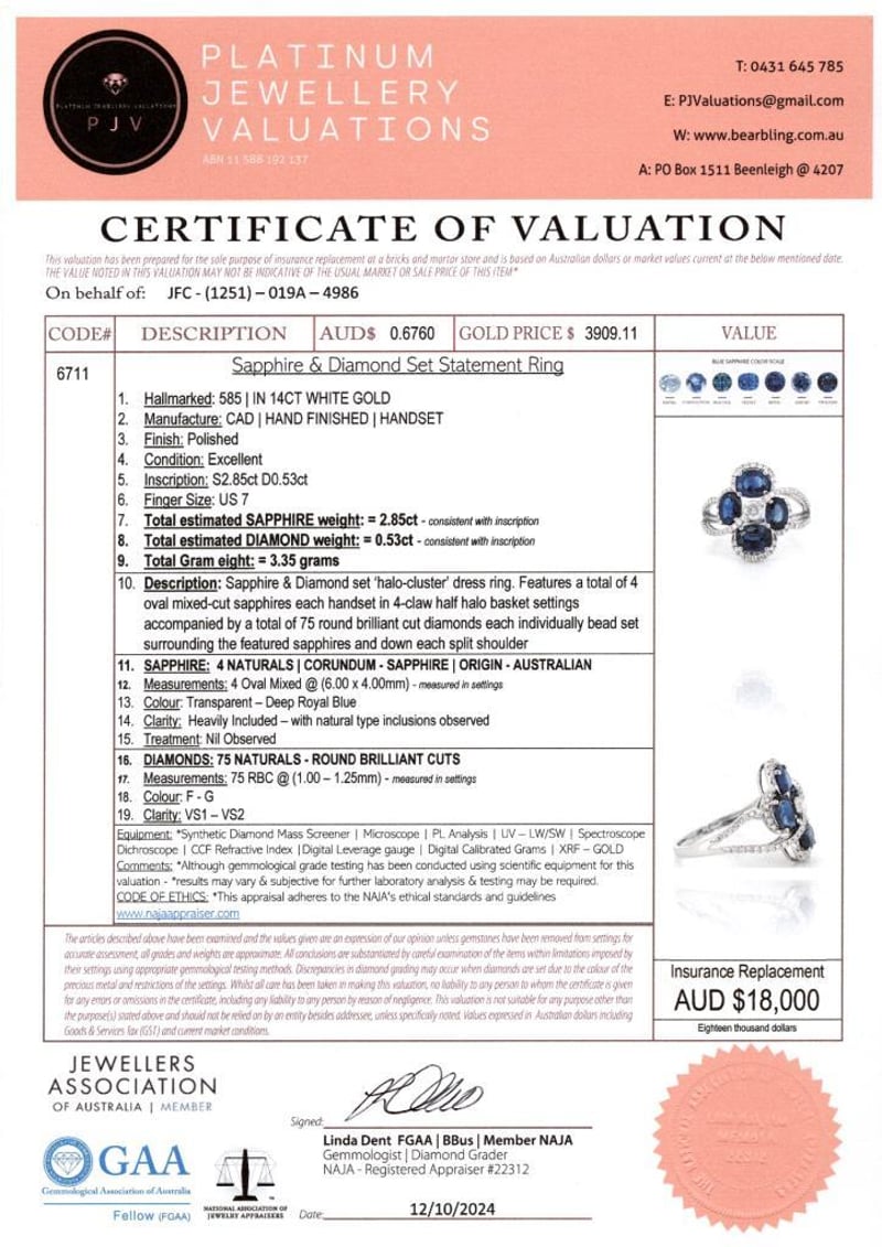 14CT WHITE GOLD AUSTRALIAN SAPPHIRE AND DIAMOND STATEMENT RING FEATURING CENTRE, 4 OVAL MIXED CUT, DEEP ROYAL BLUE AUSTRALIAN SAPPHIRES (2.85CT TSW, HEAVILY INCLUDED), CLAW SET, WITH 75 ROUND BRILLIANT CUT DIAMONDS (0.53CT TDW, F-G COLOUR, VS1-VS2 CLARITY), BEAD SET. RING SIZE O. Valuations Provided by an Independent Third-Party Professional Not Directly Associated With Lloyds Auctions at AUD $18000This valuation has been conducted by an independent third-party professional. The valuation amount is an assessment by the issuing valuer and does not reflect the auction value of the item. Any inquiries regarding the valuation should be directed to the issuing valuer (refer to contact details on the certificate), as Lloyds Auctions has no affiliation or influence over the valuation, the valuer, or the stated amount. Condition: Good - Refer Images 0+479