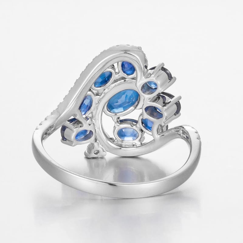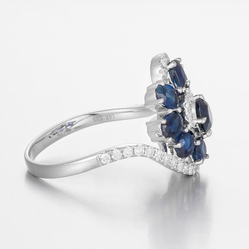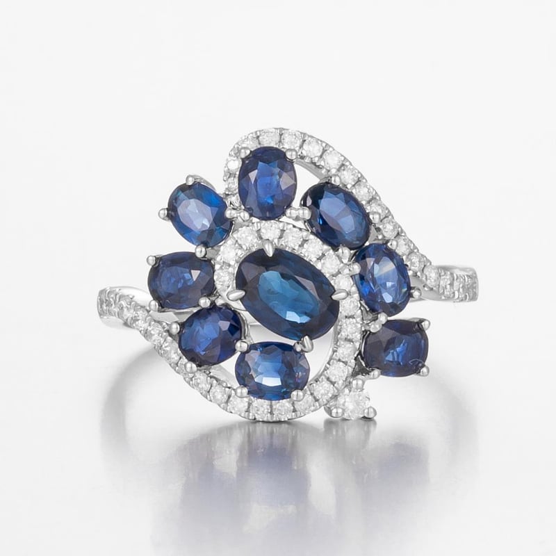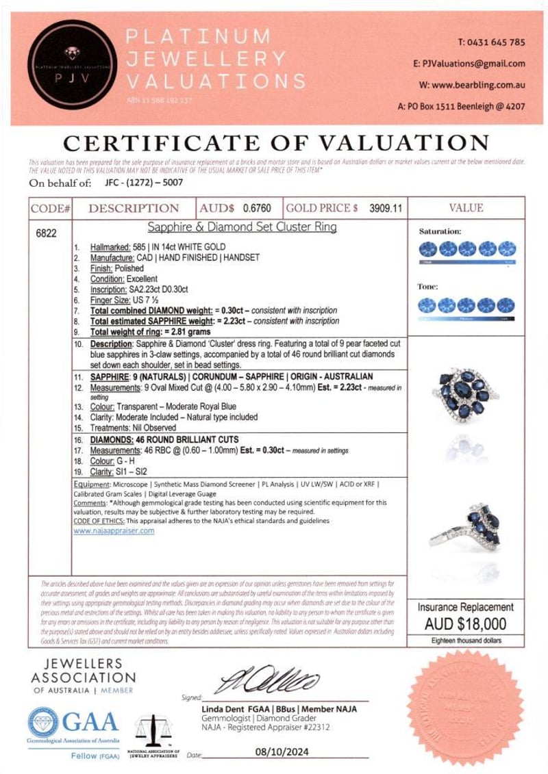 14CT WHITE GOLD AUSTRALIAN BLUE SAPPHIRE AND DIAMOND CLUSTER RING FEATURING CENTRE, 9 OVAL MIXED CUT, MODERATE ROYAL BLUE AUSTRALIAN SAPPHIRES (2.23CT TSW, MODERATE INCLUDED), CLAW SET, WITH 46 ROUND BRILLIANT CUT DIAMONDS (0.30CT TDW, G-H COLOUR, SI1-SI2 CLARITY), BEAD SET. RING SIZE O. Valuations Provided by an Independent Third-Party Professional Not Directly Associated With Lloyds Auctions at AUD $18000This valuation has been conducted by an independent third-party professional. The valuation amount is an assessment by the issuing valuer and does not reflect the auction value of the item. Any inquiries regarding the valuation should be directed to the issuing valuer (refer to contact details on the certificate), as Lloyds Auctions has no affiliation or influence over the valuation, the valuer, or the stated amount. Condition: Good - Refer Images 0+480