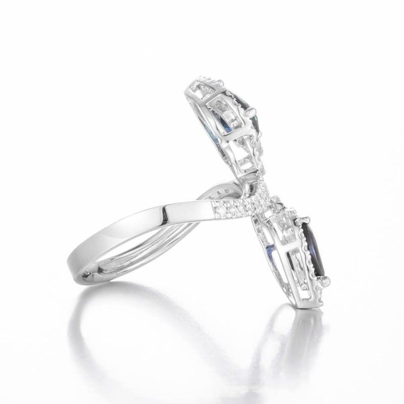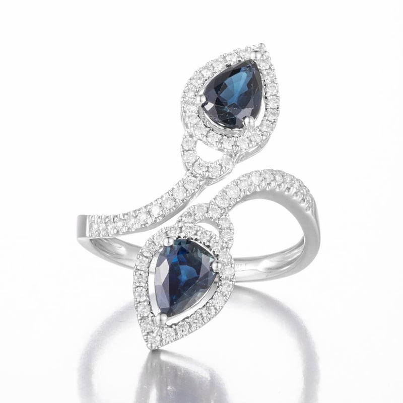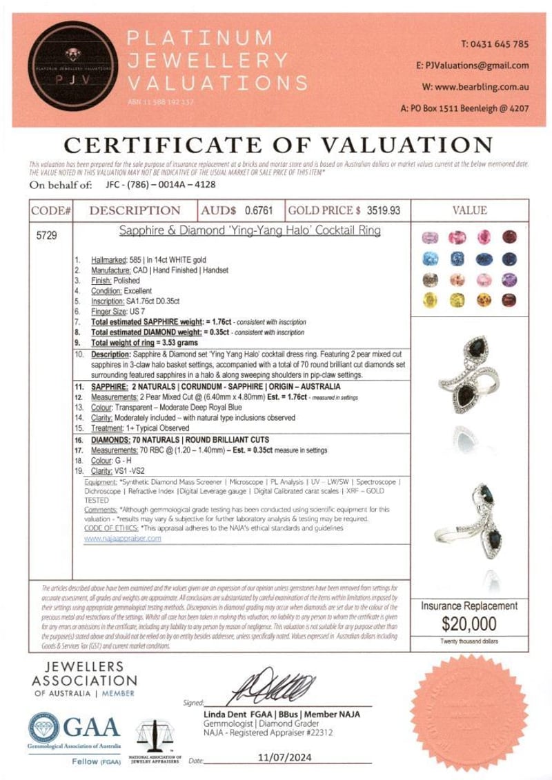 14CT WHITE GOLD AUSTRALIAN SAPPHIRE AND DIAMOND SPIRAL RING FEATURING CENTRE, 2 PEAR CUT, MODERATE DEEP ROYAL BLUE AUSTRALIAN SAPPHIRES (1.76CT TSW, MODERATELY INCLUDED), CLAW SET, WITH 70 ROUND BRILLIANT CUT DIAMONDS (0.35CT TDW, G-H COLOUR, VS1-VS2 CLARITY), PIP CLAW SET. RING SIZE O. Valuations Provided by an Independent Third-Party Professional Not Directly Associated With Lloyds Auctions at AUD $20000This valuation has been conducted by an independent third-party professional. The valuation amount is an assessment by the issuing valuer and does not reflect the auction value of the item. Any inquiries regarding the valuation should be directed to the issuing valuer (refer to contact details on the certificate), as Lloyds Auctions has no affiliation or influence over the valuation, the valuer, or the stated amount. Condition: Good - Refer Images 0+460
