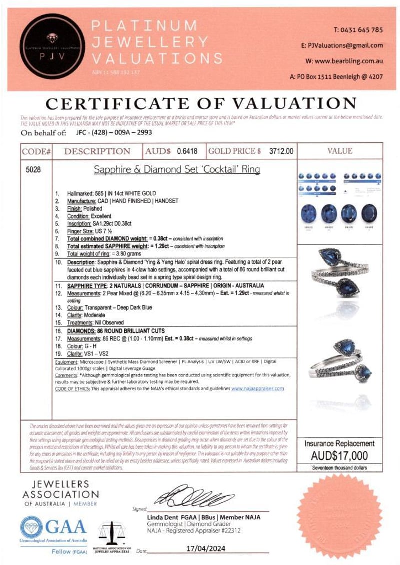 14CT WHITE GOLD AUSTRALIAN SAPPHIRE AND DIAMOND SPIRAL RING FEATURING CENTRE, 2 PEAR CUT, DEEP DARK BLUE AUSTRALIAN SAPPHIRES (1.29CT TSW, MODERATELY INCLUDED), CLAW SET, WITH 86 ROUND BRILLIANT CUT DIAMONDS (0.38CT TDW, G-H COLOUR, VS1-VS2 CLARITY), BEAD SET. RING SIZE O. Valuations Provided by an Independent Third-Party Professional Not Directly Associated With Lloyds Auctions at AUD $17000This valuation has been conducted by an independent third-party professional. The valuation amount is an assessment by the issuing valuer and does not reflect the auction value of the item. Any inquiries regarding the valuation should be directed to the issuing valuer (refer to contact details on the certificate), as Lloyds Auctions has no affiliation or influence over the valuation, the valuer, or the stated amount. Condition: Good - Refer Images 0+468