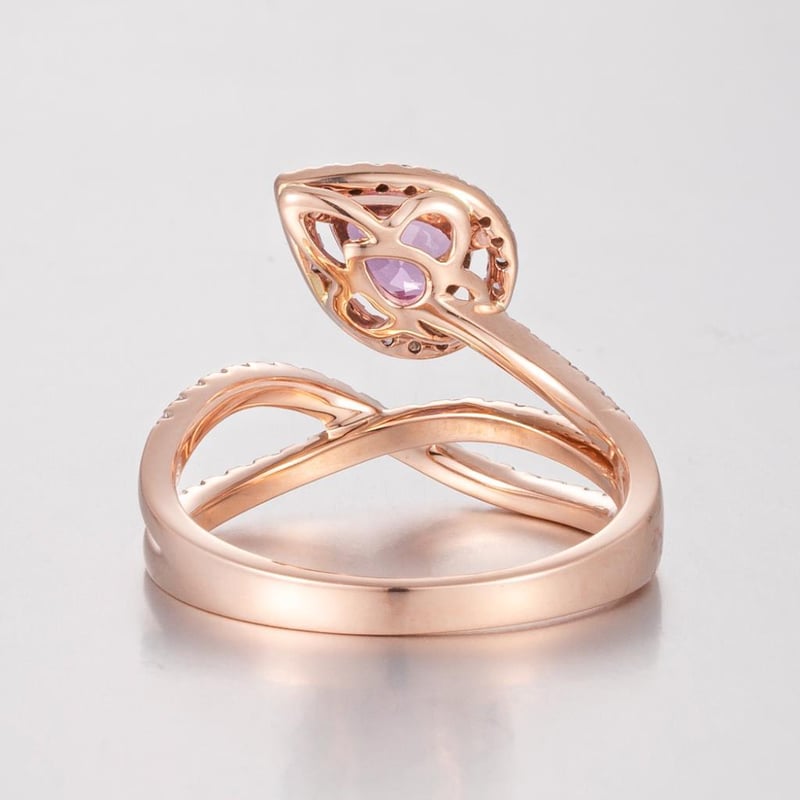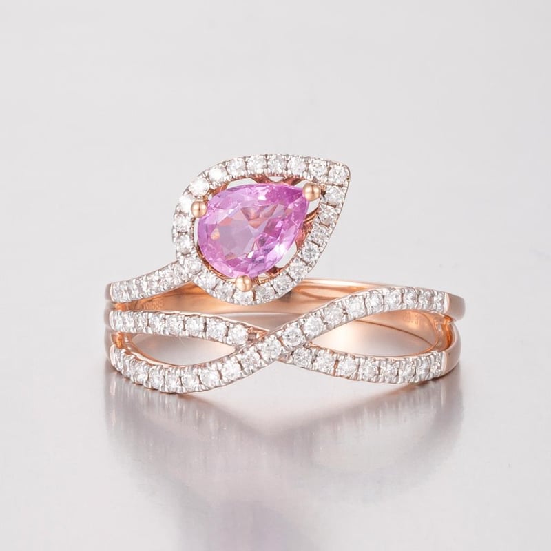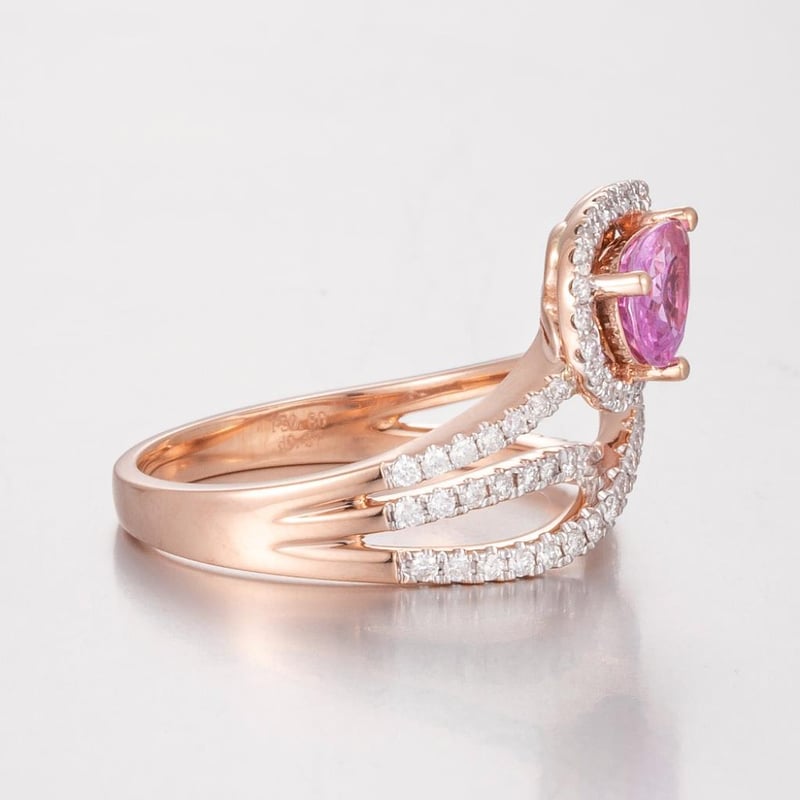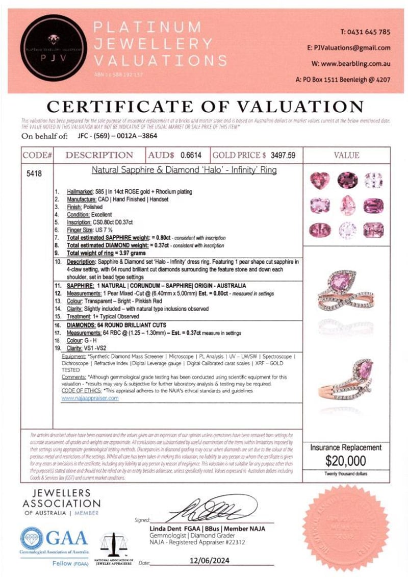 14CT ROSE GOLD PINK SAPPHIRE AND DIAMOND TWIST RING FEATURING CENTRE, ONE PEAR CUT, BRIGHT PINKISH RED, SAPPHIRE (0.80CT, SLIGHTLY INCLUDED), CLAW SET, WITH 64 ROUND BRILLIANT CUT DIAMONDS (0.37CT TDW, G-H COLOUR, VS1-VS2 CLARITY), BEAD SET. RING SIZE O. Valuations Provided by an Independent Third-Party Professional Not Directly Associated With Lloyds Auctions at AUD $20000This valuation has been conducted by an independent third-party professional. The valuation amount is an assessment by the issuing valuer and does not reflect the auction value of the item. Any inquiries regarding the valuation should be directed to the issuing valuer (refer to contact details on the certificate), as Lloyds Auctions has no affiliation or influence over the valuation, the valuer, or the stated amount. Condition: Good - Refer Images 0+462