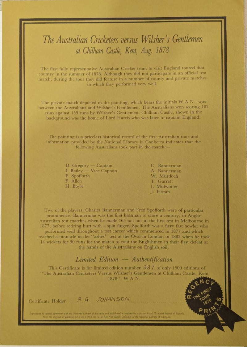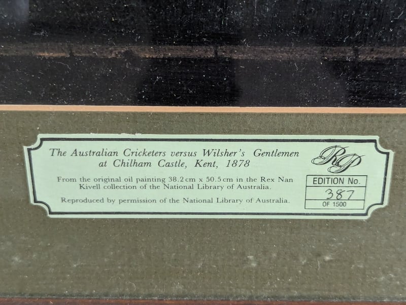 ARTIST UNKNOWNLimited Edition Lithograph On PaperTitle: The Australian Cricketer Vs Wilshers Gentlemen At Chilham Castle, Kent, 1878Image Size: 38cm x 50cmFrame Size: 56cm x 67cmEdition: 387/1500Signature Details: UnsignedAccompanied By A Certificate Of AuthenticityCondition: Good - Refer To Images584905+21