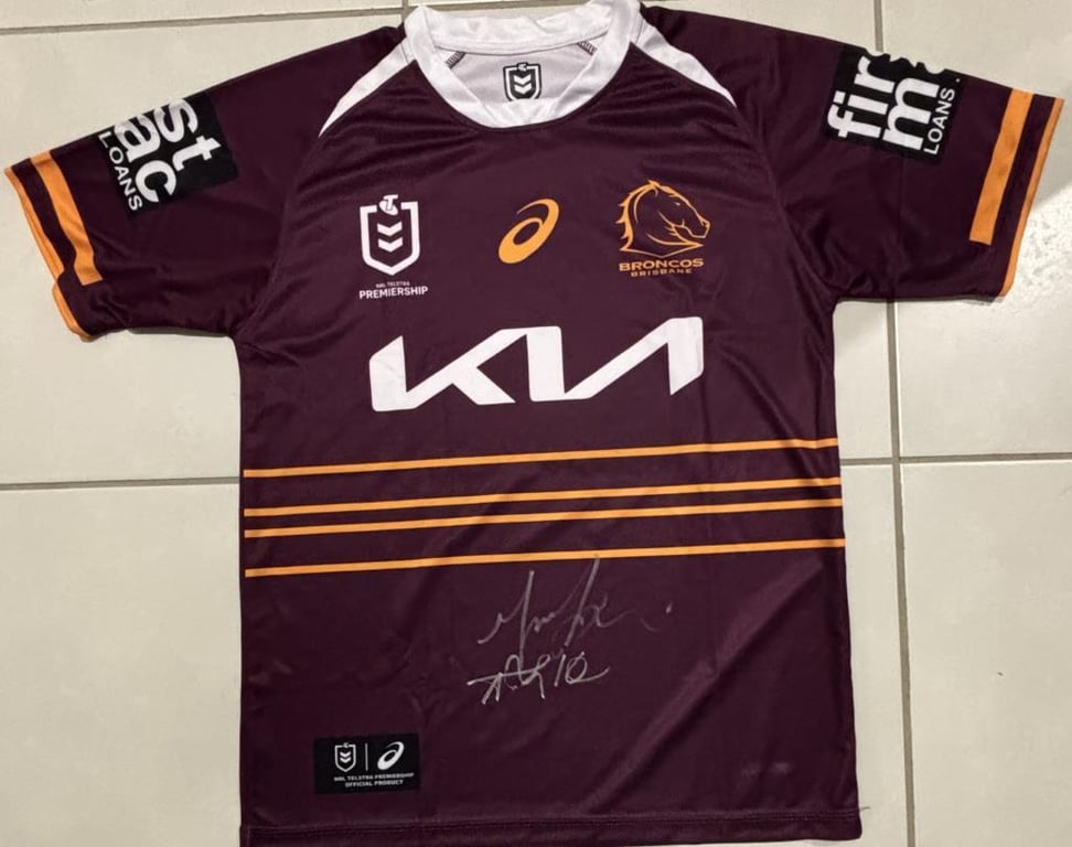 BRISBANE BRONCOS 2025 CAPTAIN & COACH SIGNED JERSEY Brisbane Broncos 2025 Nrl Champions Jersey Signed By Capatinb Adam Reynolds And Coach Michael Maguire. The Jersey Is Size M. The Item Is Accompanied By A Certificate Of Authenticity. +8