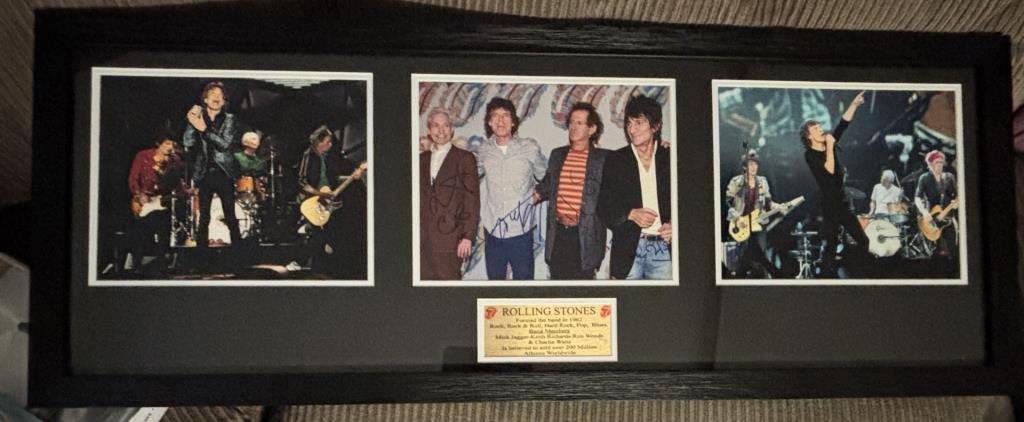 The Rolling Stones Personally Signed By Mick Jagger, Keith Richards, Roon Wood And Charlie Watts (D 2021) 10 X 8 Photo. One Of Music'S Greatest Bands, The Stones Are Still Performing Since Being Formed In 1963. The Photo Is Custom Framed With Two Unsigned Stones Concert Photos And A Gold Plaque. Measuring 970 X 320, This Is Ready To Hang. The Item Is Accompanied By A Certificate Of Authenticity.