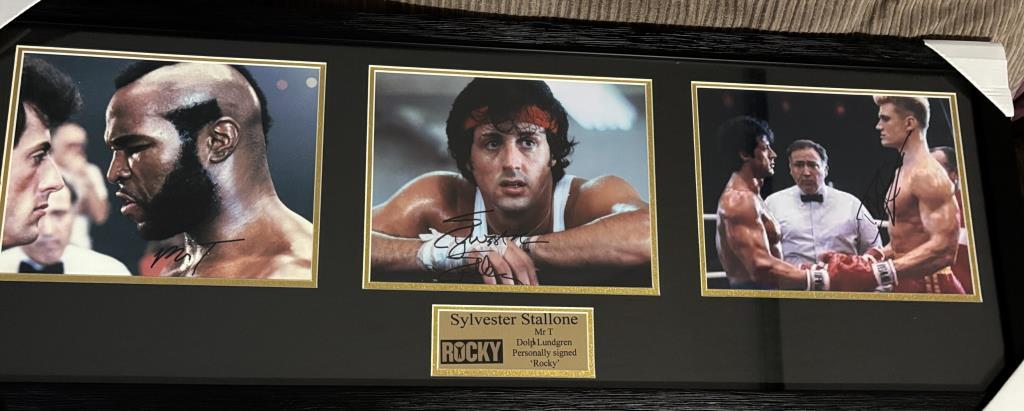 Rocky, Ivan Drago And Clubber Lang Set Of Three 10 X 8 Photos Personally Signed By Sylvester Stallone, Dolph Lundgren And Mr T. The Rocky And Opponents Signed Prints Are Custom Framed With A Gold Plaque. Measuring 970 X 320, This Is Ready To Hang. The Item Is Accompanied By Three Certificates Of Authenticity.