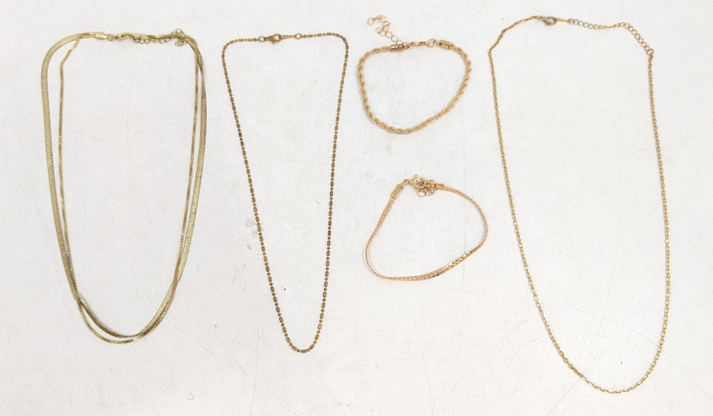 THREE YELLOW GOLD PLATED CHAIN NECKLACE AND TWO YELLOW GOLD PLATED CHAIN BRACELETS