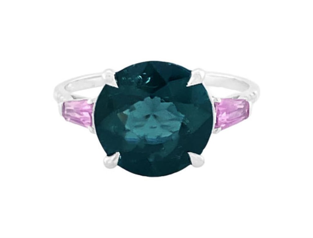 9CT WHITE GOLD LONDON BLUE TOPAZ, PINK SAPPHIRE AND DIAMOND RING