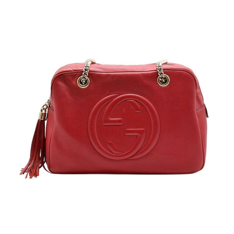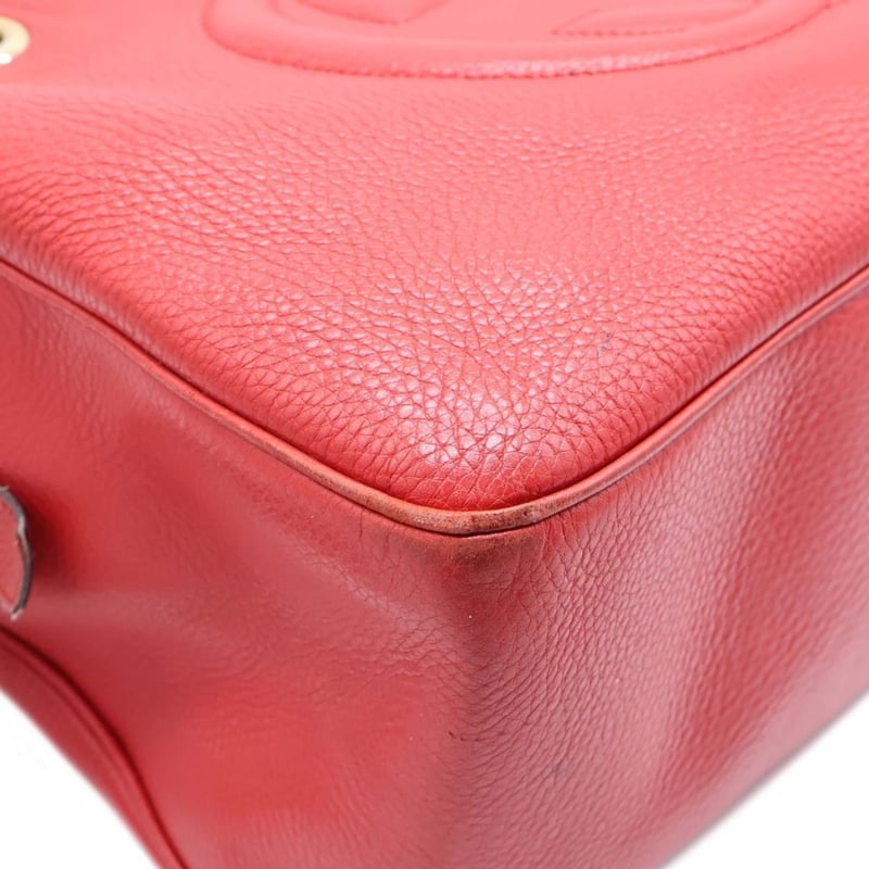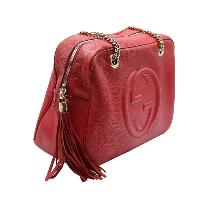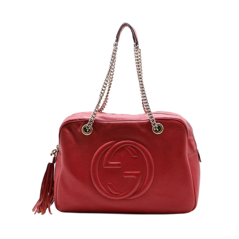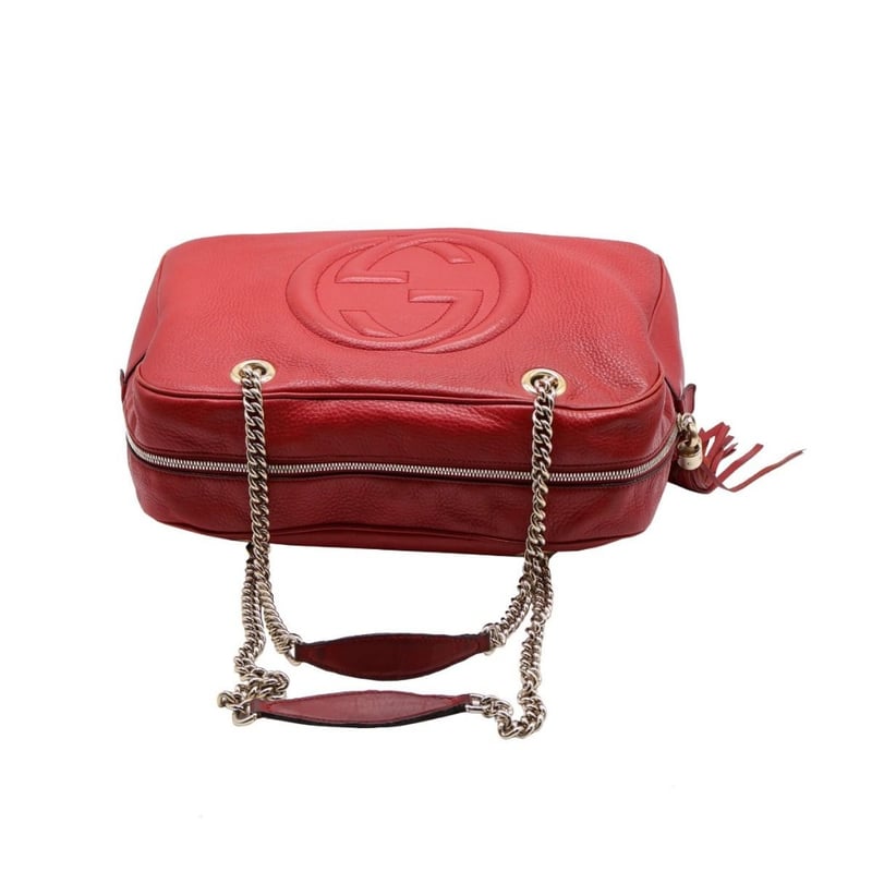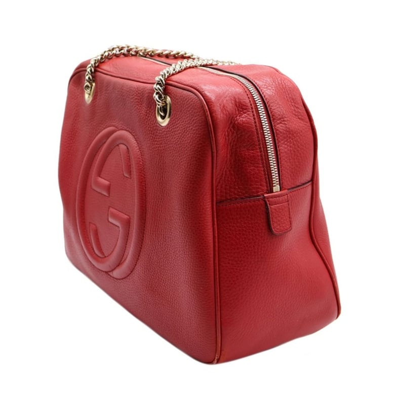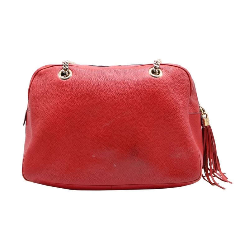 GUCCI RED LEATHER SOHO CHAIN SHOULDER BAGItem Size: Height: 26cm, Width: 37cm, Depth: 15cmExterior MaterialLeather With Gold-Tone Hardware, Zip Around Closure And Dual Shoulder Straps.Interior MaterialTextile Lining With A Main Compartment, A Zipped Pocket And Two Patch Pockets.Additional Condition Report- Moderate Sign Of Wear, Tears And Darken On Exterior- Visible Scuffs And Creases On Exterior Corners- Visible Stains And Wear In Interior- Sign Of Wear And Scratches On HardwareShoulder Strap Drop: 25CmComes With- Original Dustbag- Certificate Of AuthCROSSDOCK162981+37