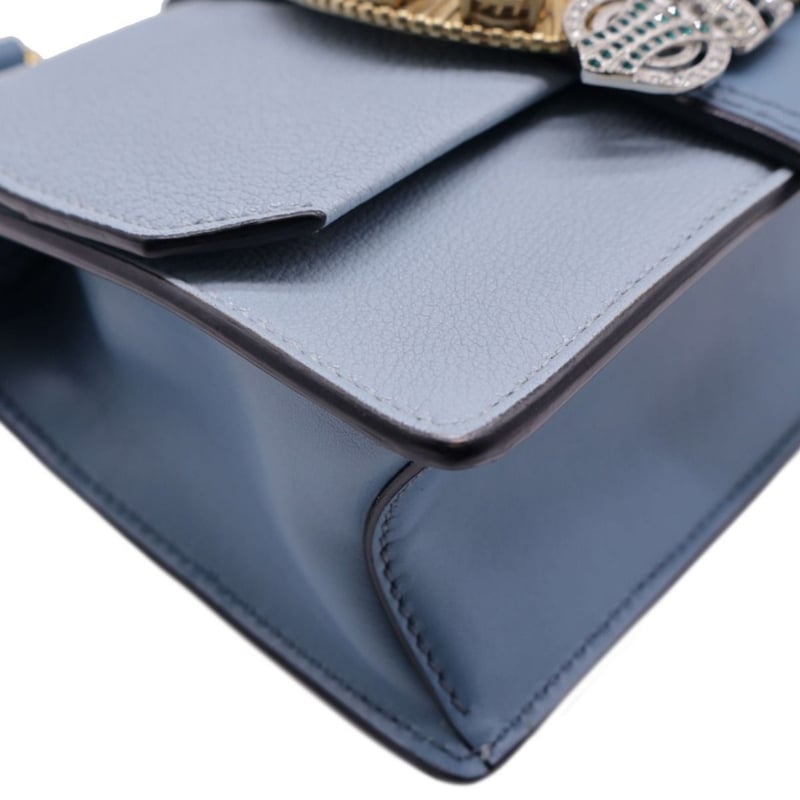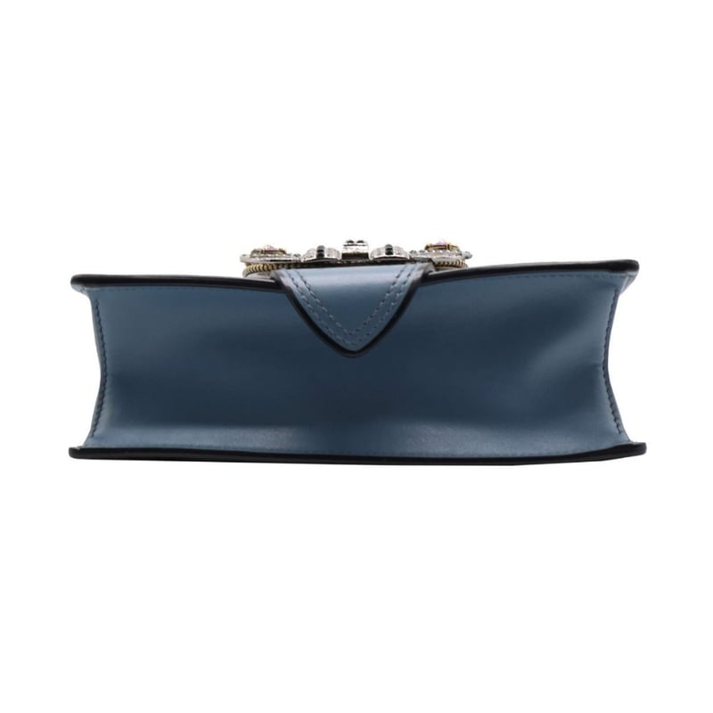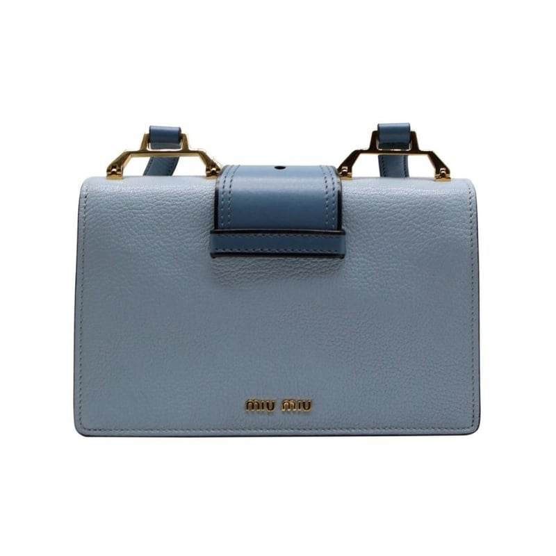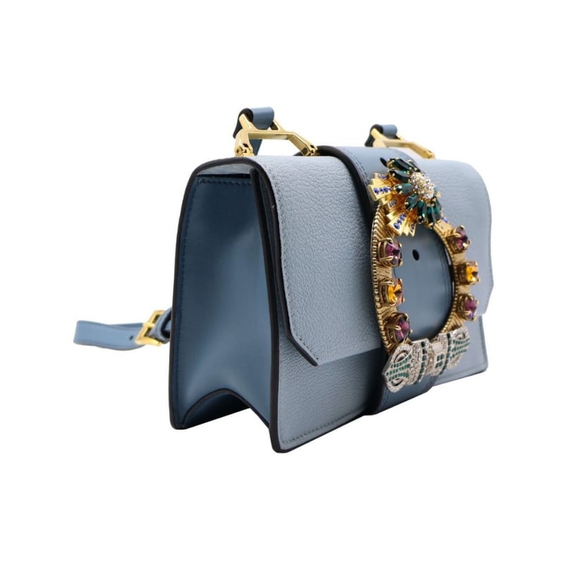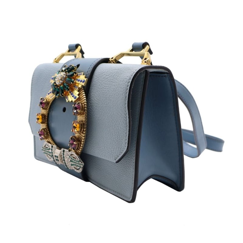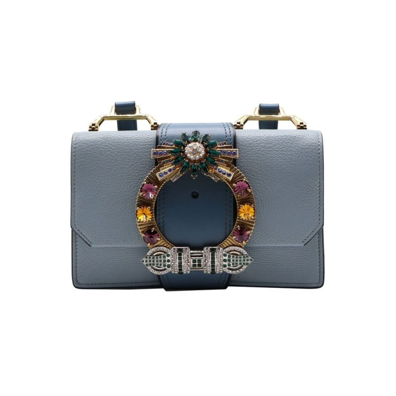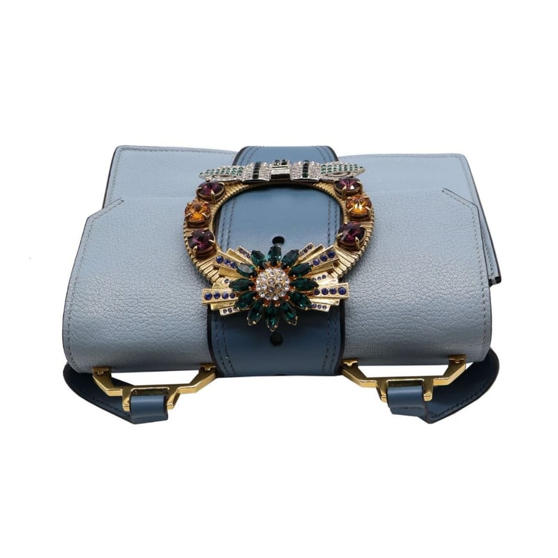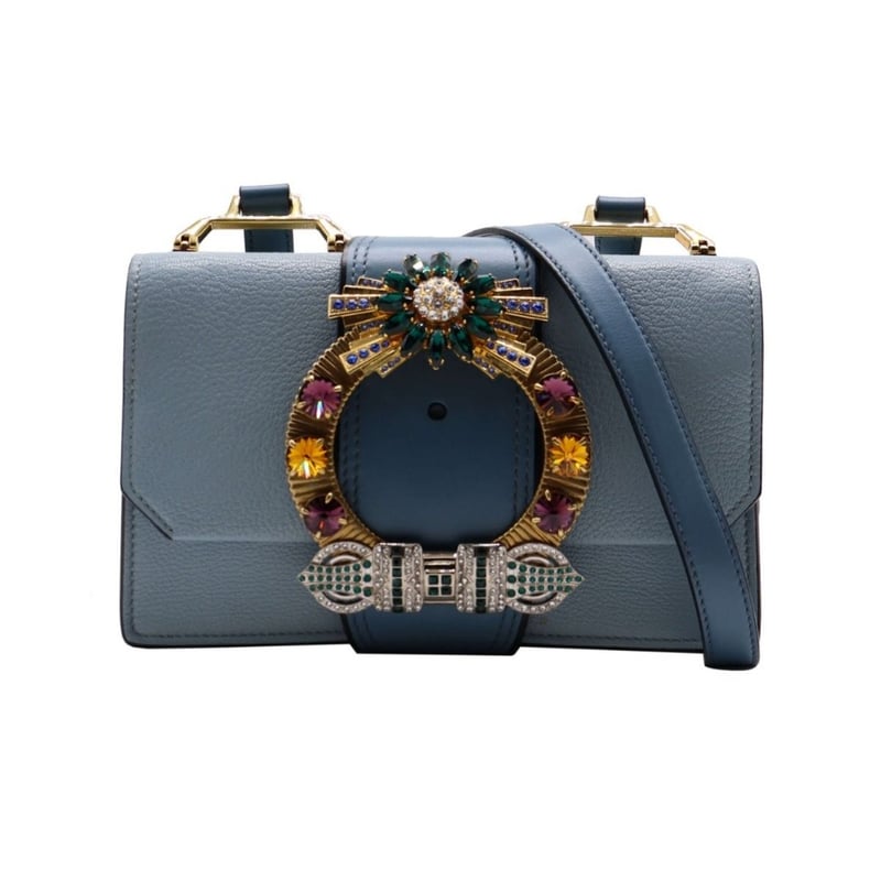MIU MIU TWO TONE BLUE MADRAS LEATHER CRYSTAL EMBELLISHED BUCKLE FLAP SHOULDER BAG