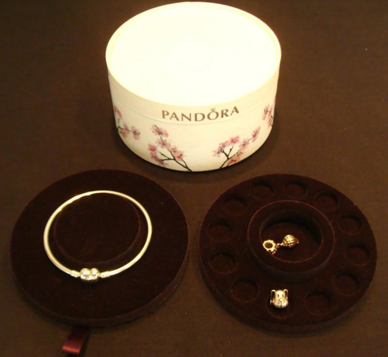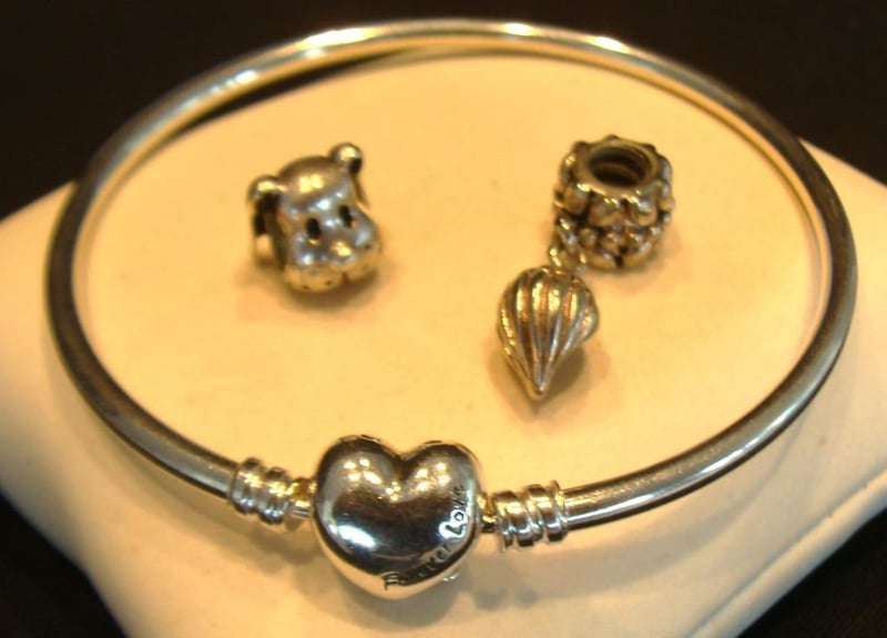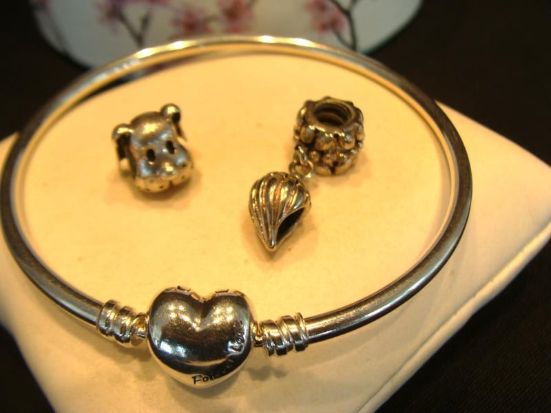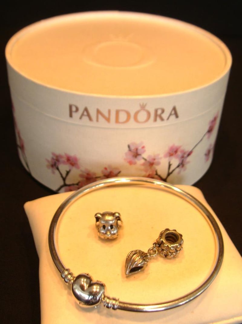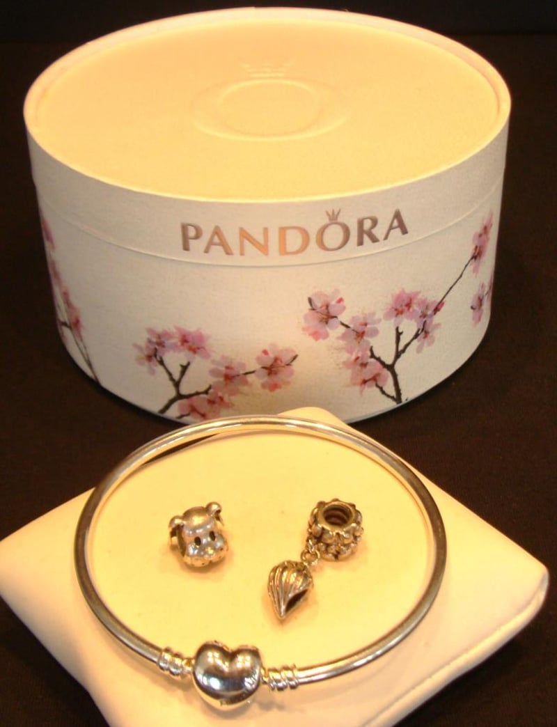 PANDORA FOREVER LOVE BANGLE STERLING SILVER S925 ALE WITH STERLING SILVER CHARMS IN PANDORA JEWELLERY BOX.