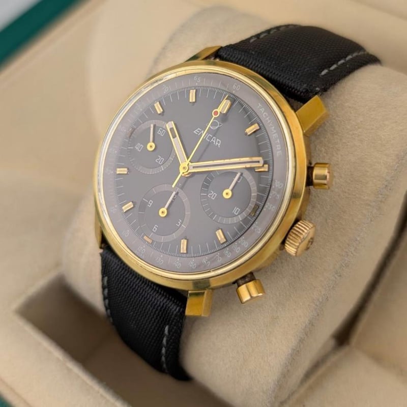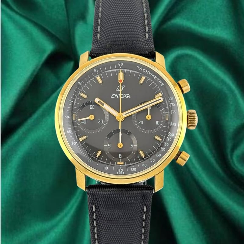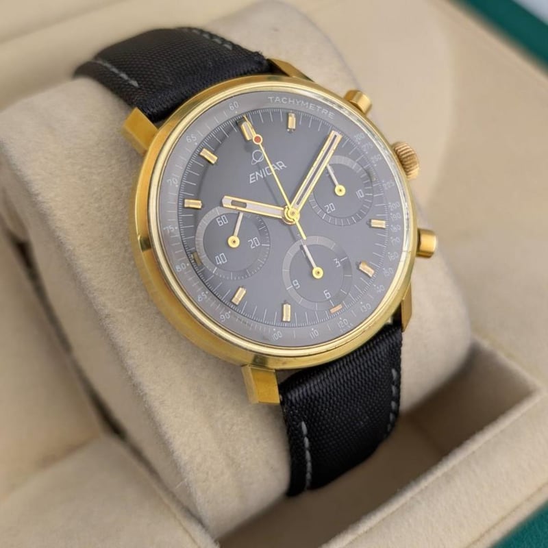 ENICAR 072/003 VALJOUX 72 GOLD-PLATED SLATE DIAL 36.5MM ~1960S Brand: EnicarReference: 072/003Model: Chronograph Valjoux 72 – Slate Dial, Gold-Plated CaseCase Size: 36.5MmCirca: ~1960SMovement: Manual WindingCondition: Good VintageBox: NoPapers: No Condition: Good - Refer Images 0488347+16