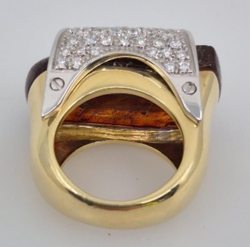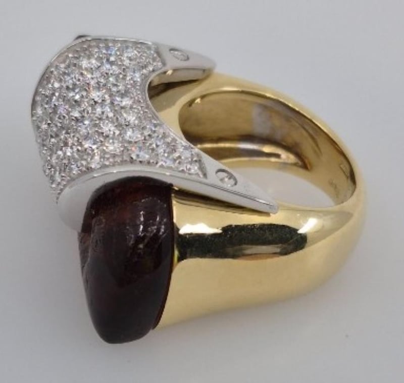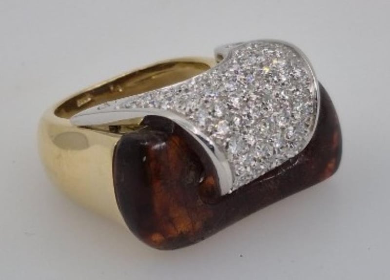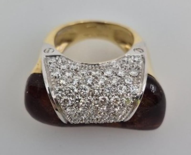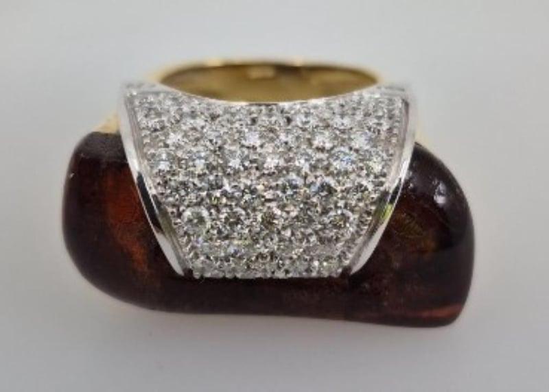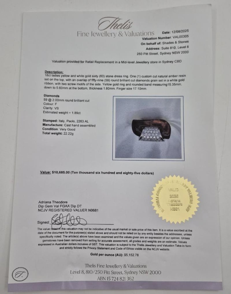 18K YELLOW AND WHITE GOLD, SIXTY STONE DRESS RINGFeaturing Custom Cut Natural Amber Resin Ser On Th Etop, With An Overlap Of 59 Round Brilliant Cut Diamonds 1.89TcwTotal Item Weight: 22.22gCondition: Good - Refer To ImagesThis valuation has been conducted by an independent third-party professional. The valuation amount is an assessment by the issuing valuer and does not reflect the auction value of the item.Any inquiries regarding the valuation should be directed to the issuing valuer (refer to contact details on the certificate), as Lloyds Auctions has no affiliation or influence over the valuation, the valuer, or the stated amount.Insurance Replacement Valuation Amount: $10,685.00VAULT587701+33