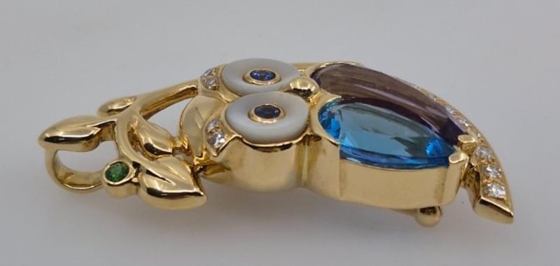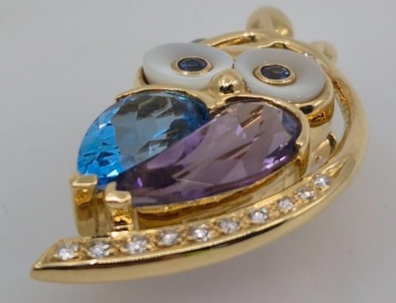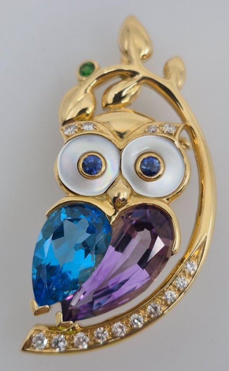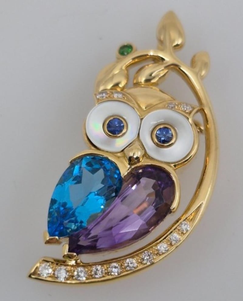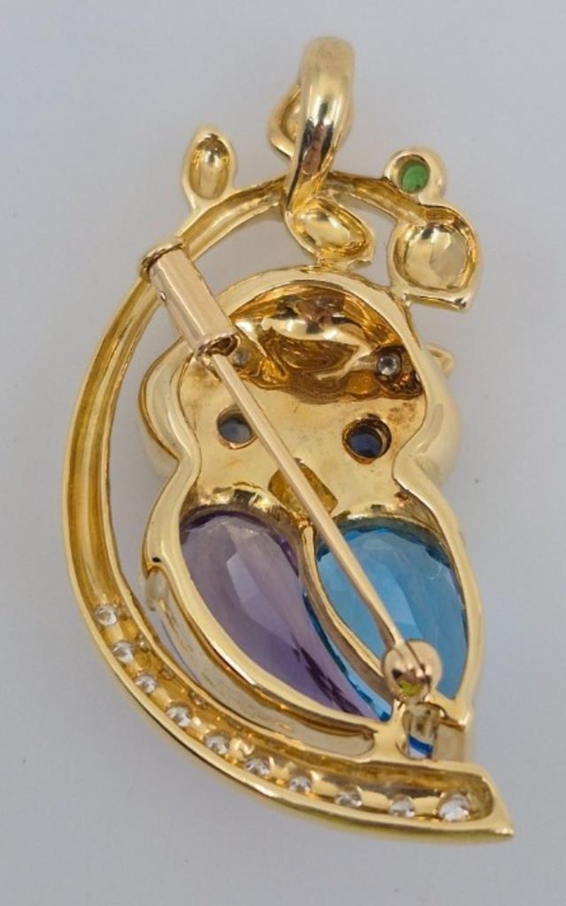Featuring 14 Pave Set Brilliant Cut Diamonds 0.24Tcw. 4Mm Long Blue Topaz In Pear Shape And 16Mm Amethyst In Pear Shape. 2 Round 2Mm Sapphires And 1X2Mm Emeralds