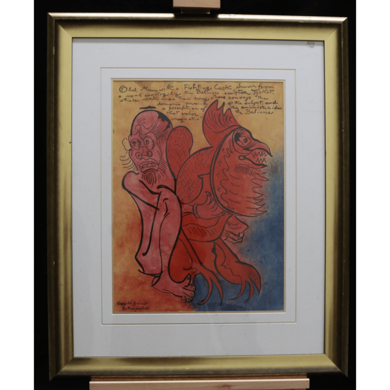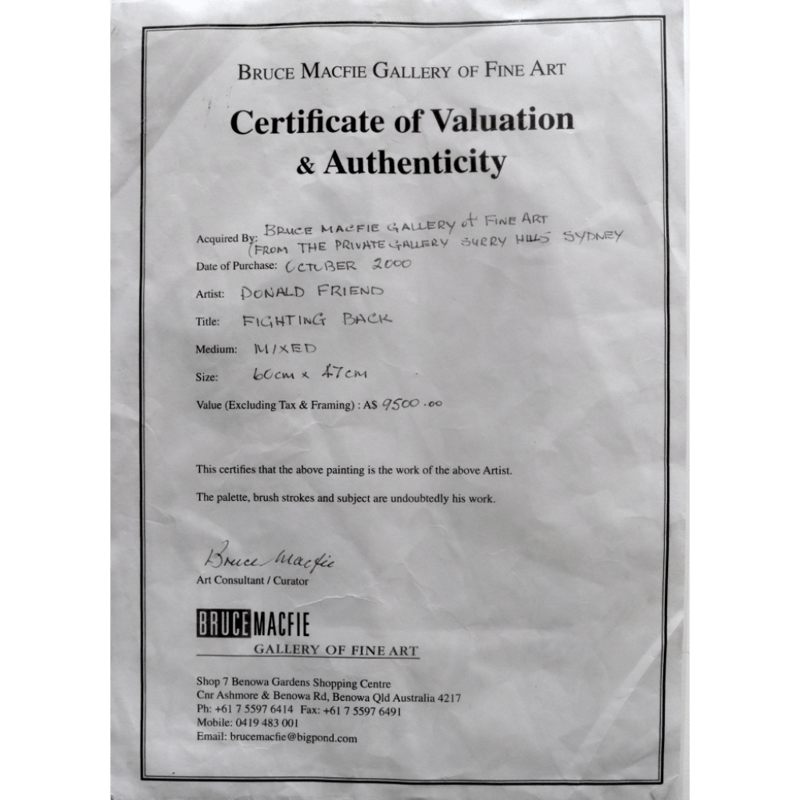 ORIGINAL 'FIGHTING COCK' DONALD FRIEND. OIL ON CANVAS, 1915-1989, FRAMED, 45CM X 60CM. COMES WITH AUTHENTICITY CERTIFICATE. Artwork Valuations Provided By A Third Party Professional Not Directly Associated With Lloyds Auctions at AUD $9,500.00This Insurance Valuation has been provided by a registered Art Valuer and is intended for insurance purposes only. The valuation amount has no bearing on the auction value of the item. Any questions regarding the valuation should be directed to the issuing Valuer (refer to contact details on the certificate) as Lloyds have no association or relationship with the Valuer or the valuation amount contained within the valuation. Condition: PRE-OWNED 645935+9103