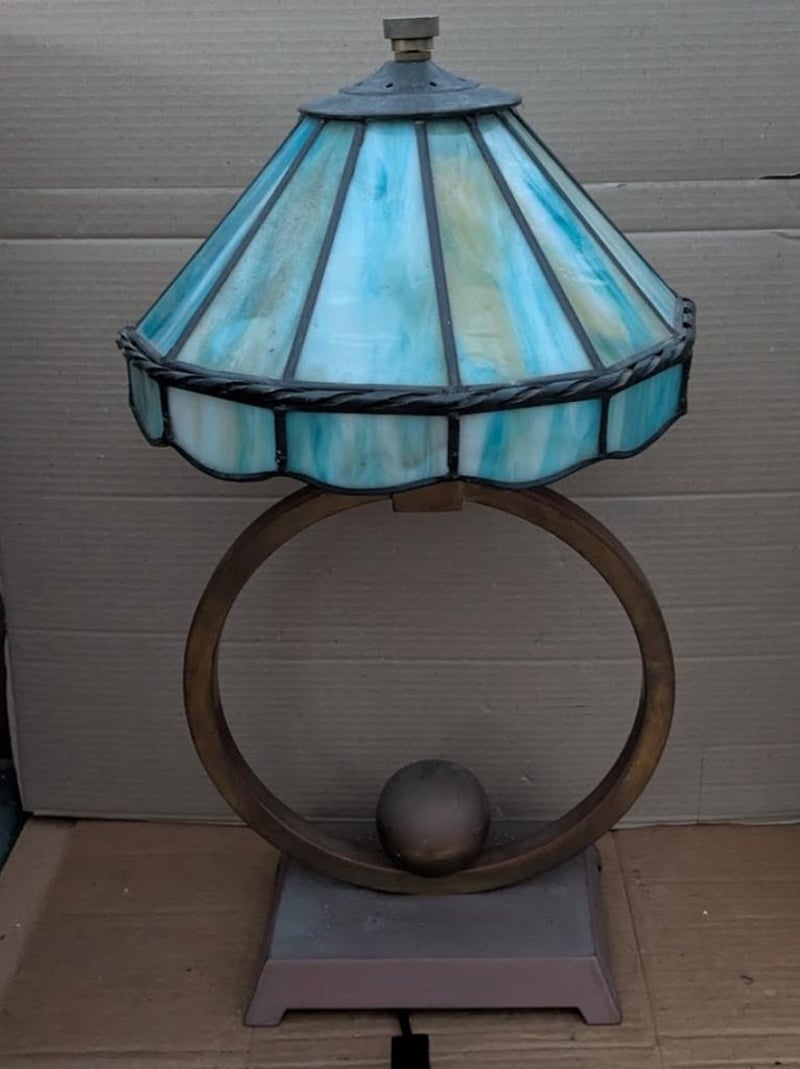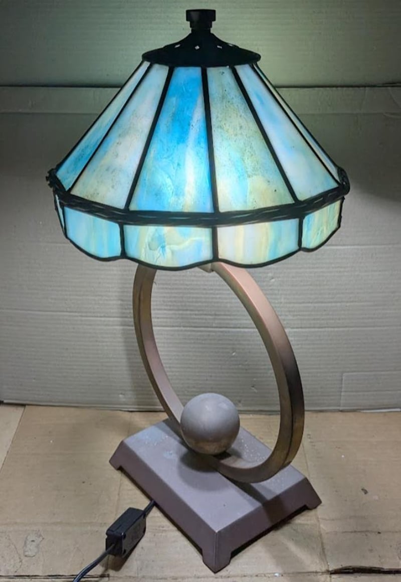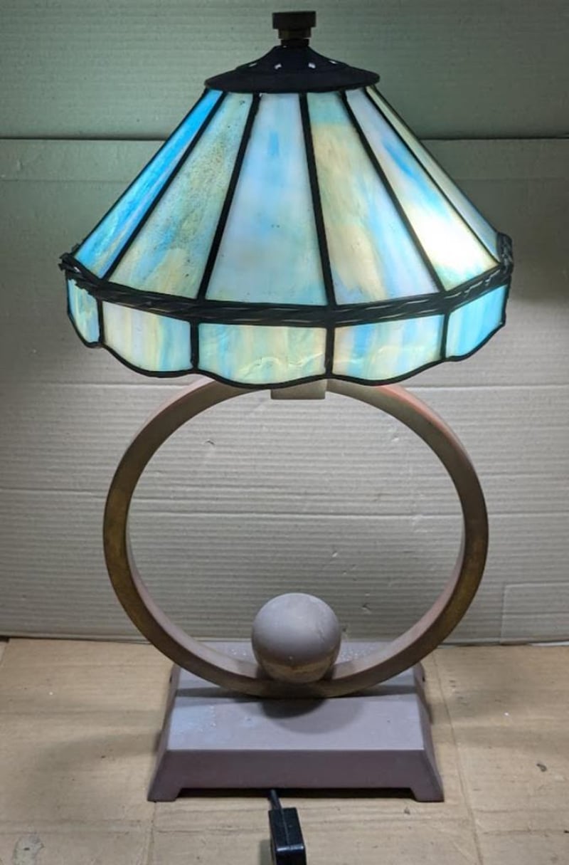 VINTAGE TABLE LAMP, LEAD LIGHT SHADE, BRASS FRAME - 60CM TALL Condition: Good - Refer To Images+1