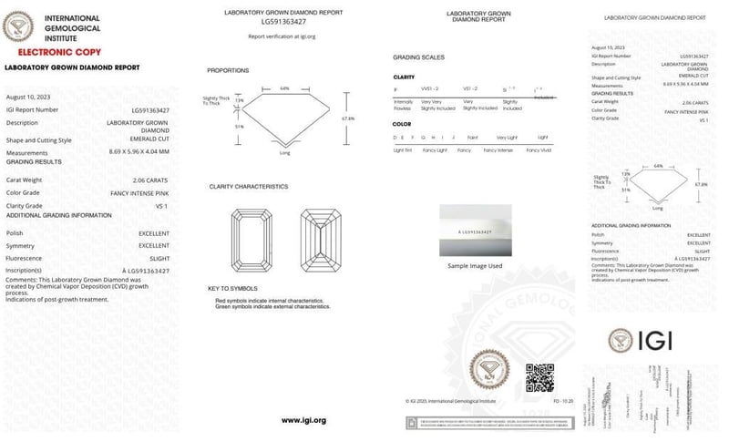 Igi Certificate # Lg 591363427 Laser Inscribed : Labgrown Igi Lg 591363427 Polish : Excellent Symmetry : Excellent Flourescence : Slight Type : Cvd