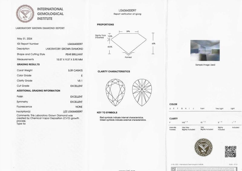 5.09 Carat Pear Brilliant Diamond E/Vs1 Igi Certificate # Lg 636430097 Laser Inscribed : Labgrown Igi Lg 636430097 Cut : Excellent Polish : Excellent Symmetry : Excellent Flourescence : Non Type : Cvd Ring Finger Size N