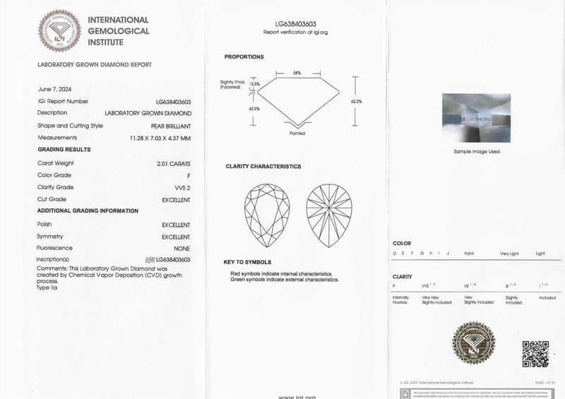 2.01 Carat Pear Brilliant Diamond F/Vvs2 Igi Certificate # Lg 638403603 Laser Inscribed : Labgrown Igi Lg 638403603 Cut : Excellent Polish : Excellent Symmetry : Excellent Flourescence : Non Type : Cvd Ring Finger Size N Ring Weight 3.30 Grams