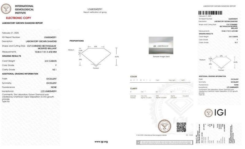 Igi Certificate # Lg 683540291 Laser Inscribed : Labgrown Igi Lg 683540291 Polish : Excellent Symmetry : Excellent Flourescence : None Type : Cvd