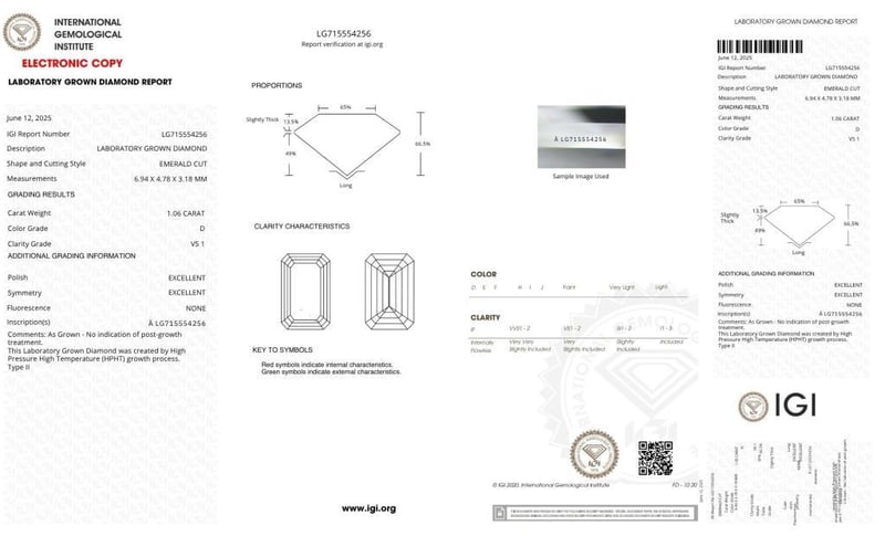 Igi Certificate # Lg 715554256 Laser Inscribed : Labgrown Igi Lg 715554256 Polish : Excellent Symmetry : Excellent Flourescence : None Type : Hpht