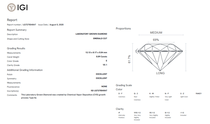 5.09 CARATS E/VS1 LAB GROWN DIAMOND - IGI CERTIFIED 5.09 Carats E/Vs1 Lab Grown Diamond - Igi CertifiedCertificate Number - 727504547Color/Clarity - E/Vs1Shape - EmeraldDimension - 12.13 X 8.17 X 5.04 MmCut - N/ASymmetry - ExcellentFluorescence - NonePolish - ExcellentExternal Video Link - Https://V360.Diamonds/C/Dbb52Dcd-9141-4945-B169-9345Febe3C24?M=I&A=727504547 Condition: Good - Refer Images 0160773+65