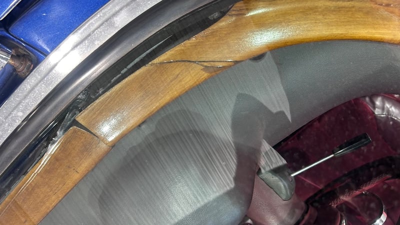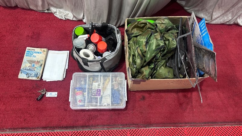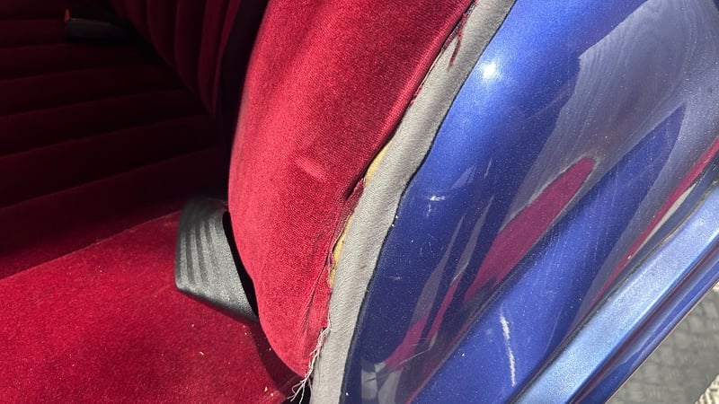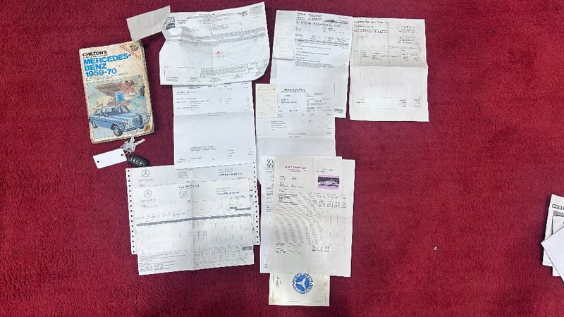 Features include air conditioning, leather interior, alloy wheels, AUX/USB, central locking, and CD player. Includes three keys, car cover, workshop repair manual, various receipts for completed works, spare parts including gaskets and trim pieces, and other maintenance items. Vendor advises vehicle was restored in 1998, including new front and rear ends and 280 twin-cam engine. Minor paint, panel, and interior trim imperfections noted.