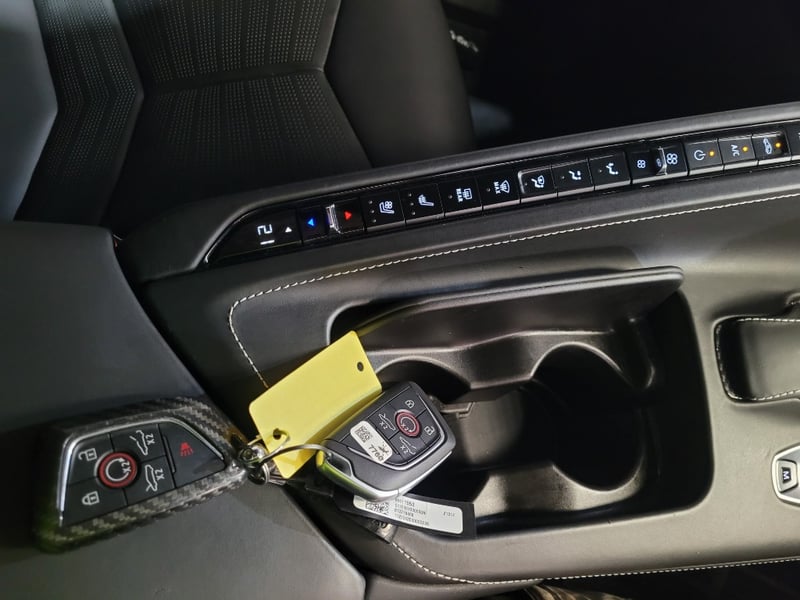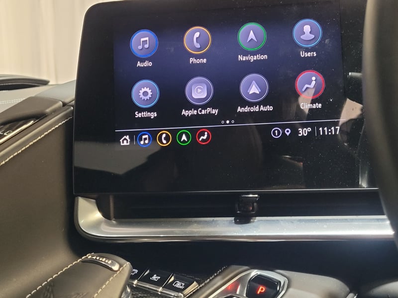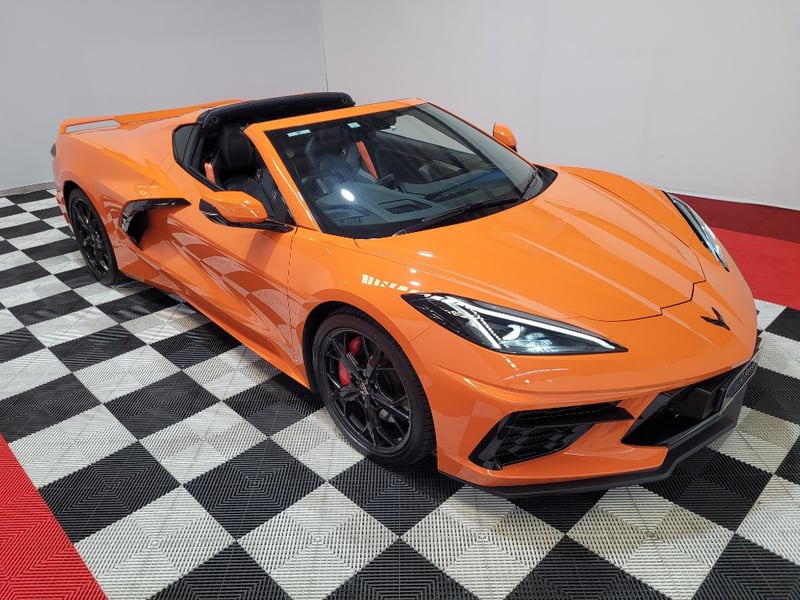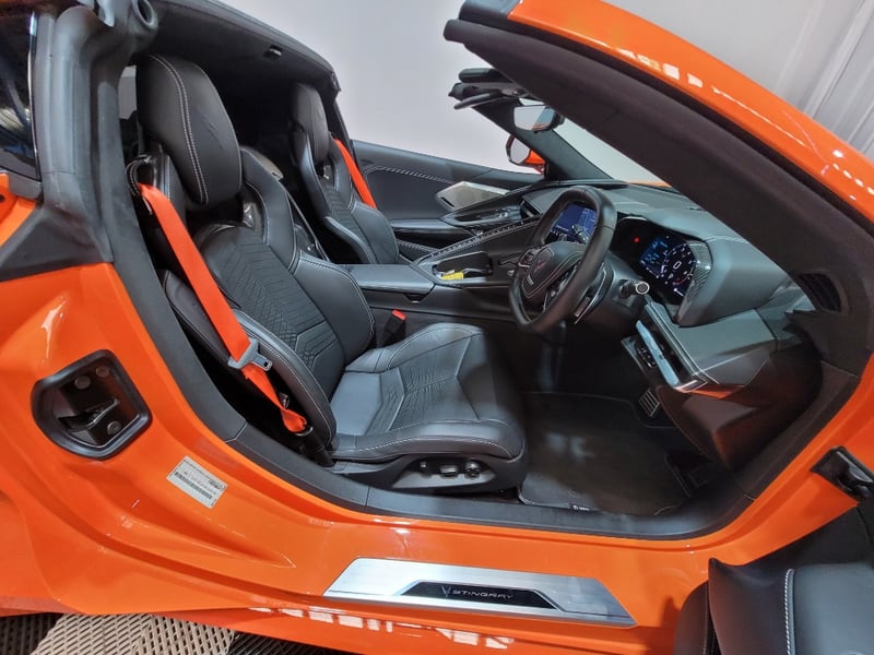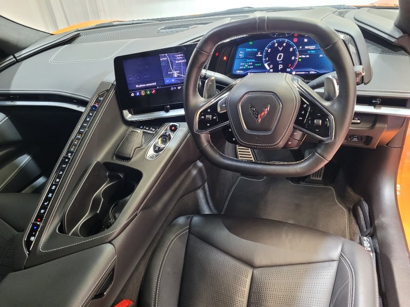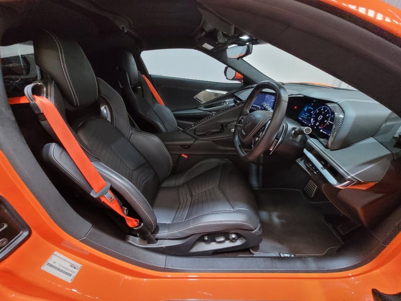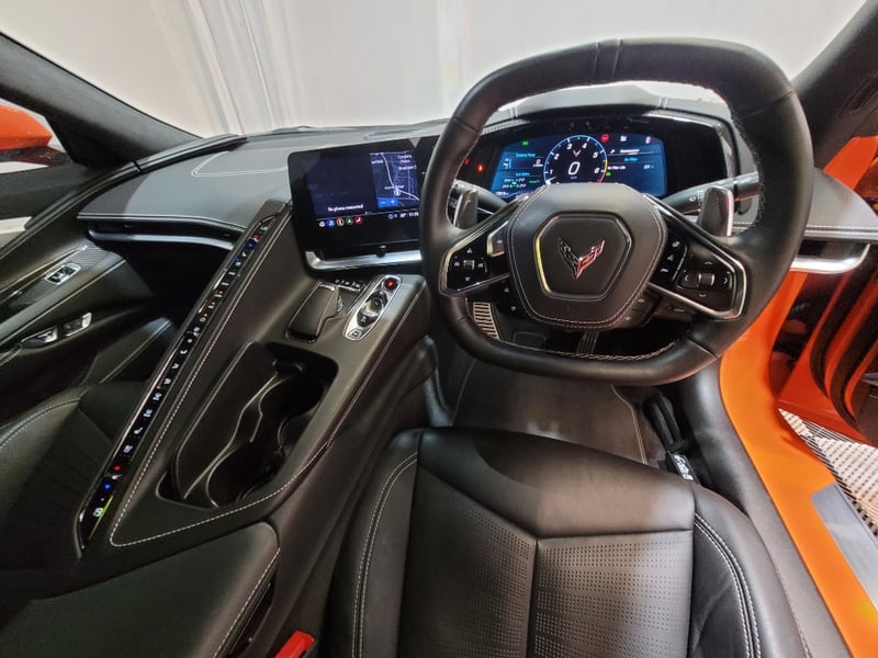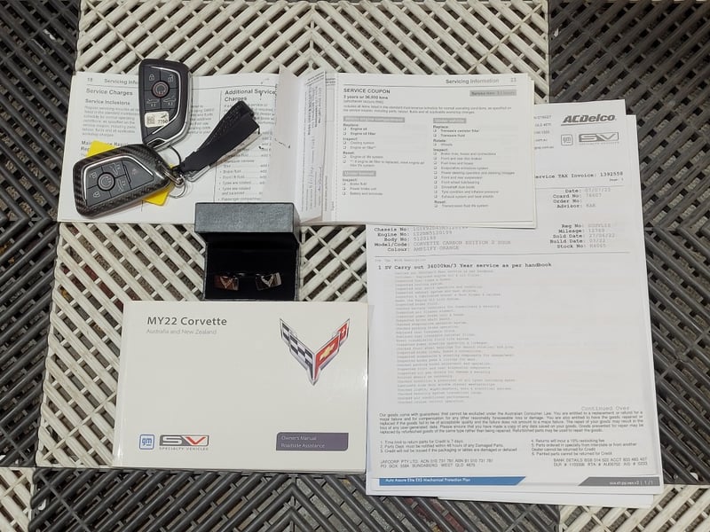 Equipped with air conditioning, power windows, SRS, Sat Nav, digital dash, power seats, tinted windows, cruise control, leather interior, climate control, AUX/USB, reverse camera, central locking, key remote start, push-to-start, paddle shift, heated and cooled seats, phone connection, CarPlay, heads-up display, 360° camera, drive modes, park assist. Includes log books, owners manual, service receipts, car cover, Corvette book, cuff links, and extra parts.