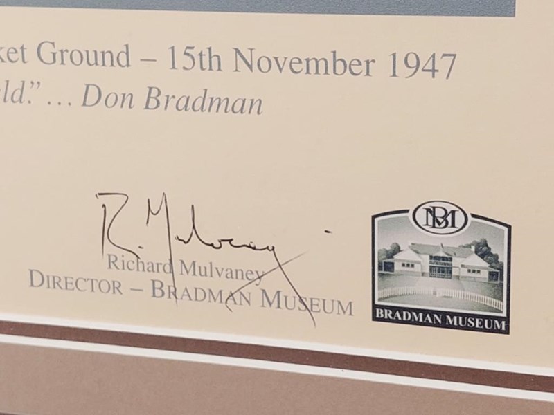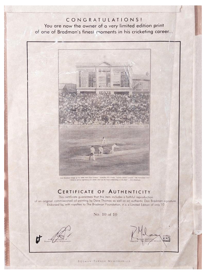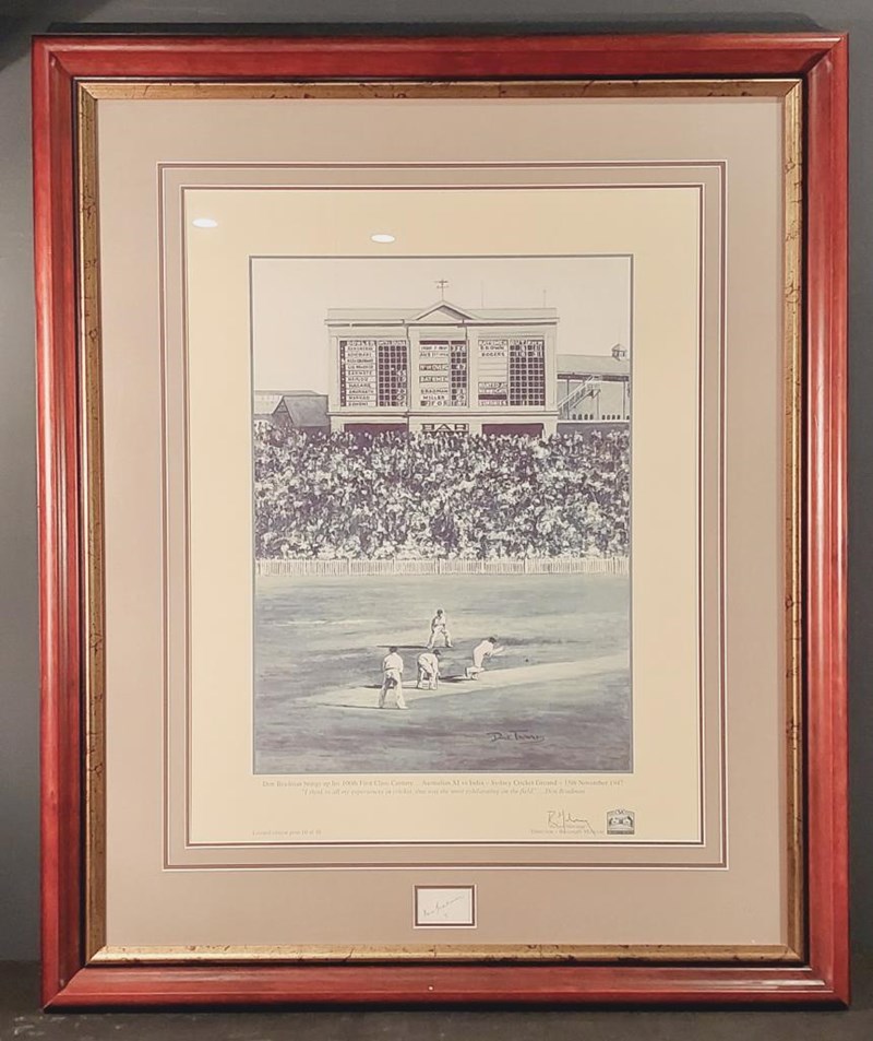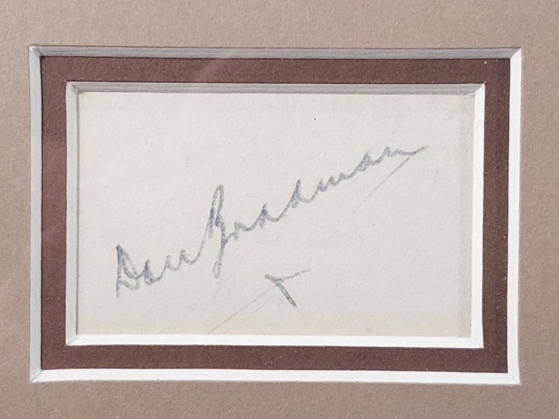 SIR DONALD BRADMAN LIMITED EDITION HANDSIGNED CARD WITH REPRODUCTION PRINT IN FRAMED DISPLAY
