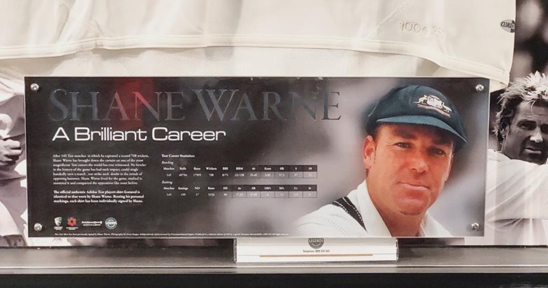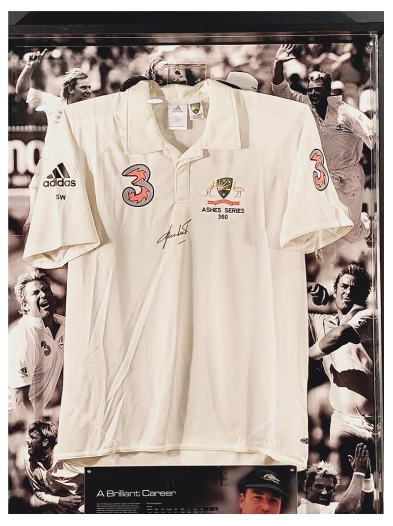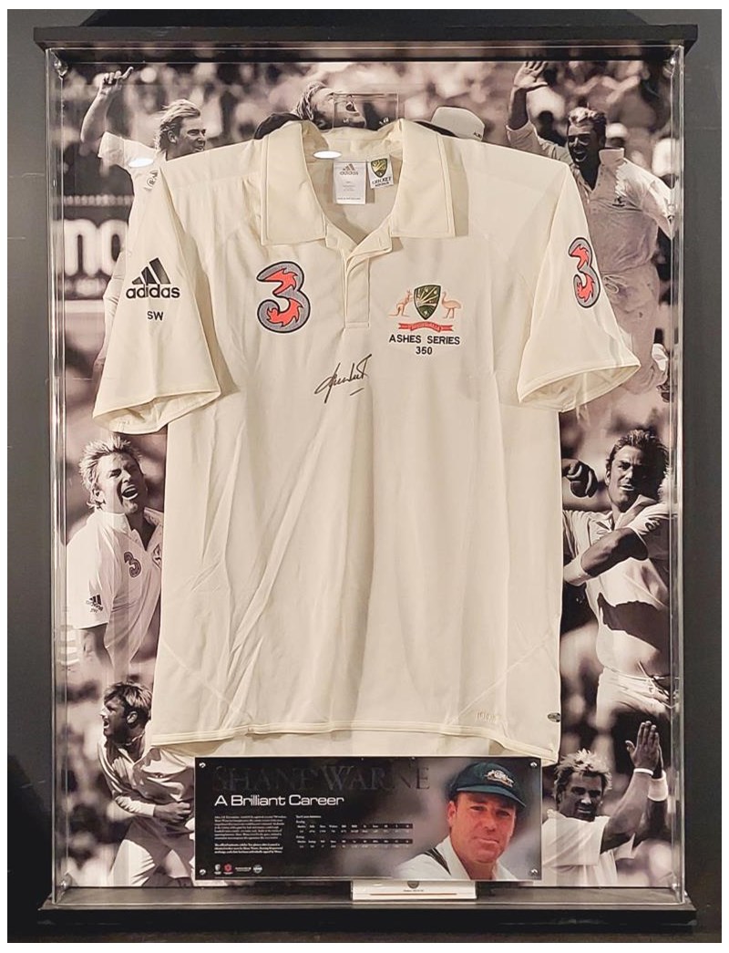 SHANE WARNE HANDSIGNED ADIDAS ASHES TEST PLAYERS SHIRT IN BOXED ACRYLIC DISPLAY FRAME