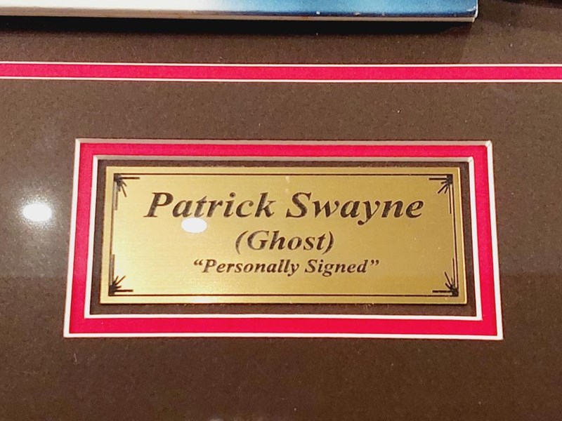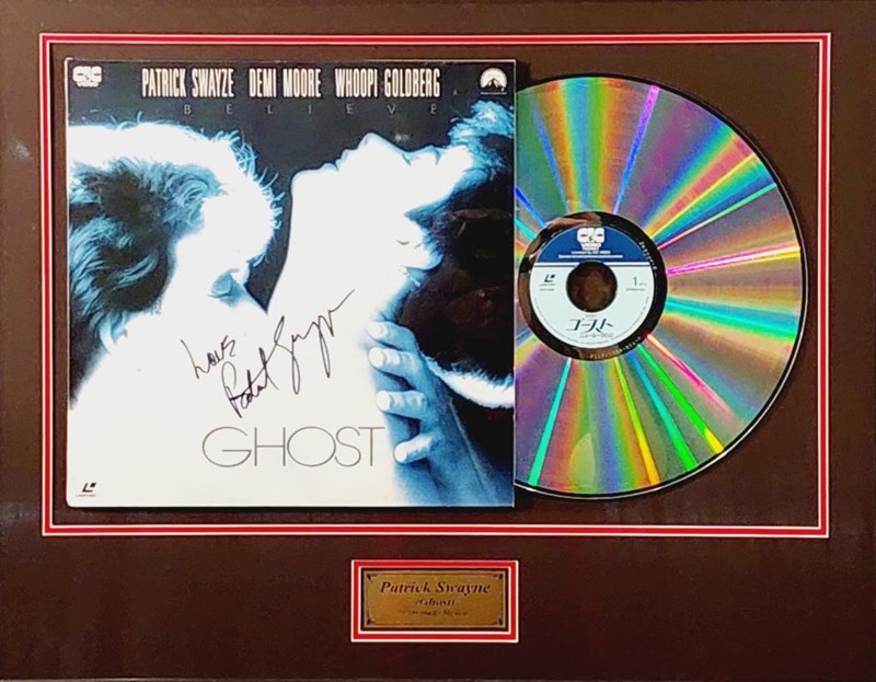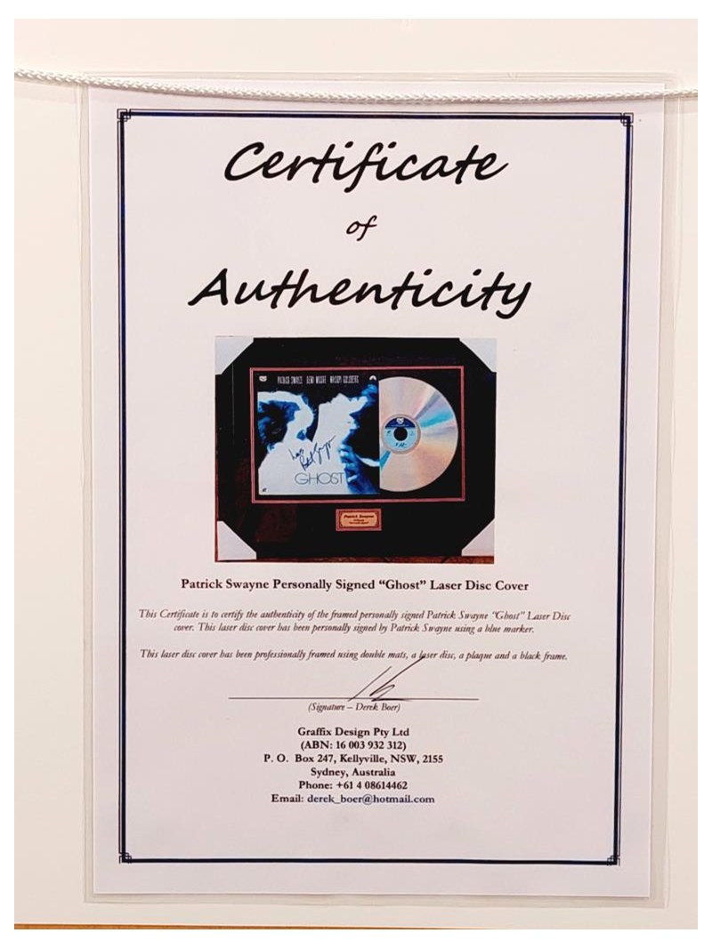 PATRICK SWAYZE HANDSIGNED "GHOST" LASERDISC COVER IN FRAMED DISPLAY Comes With Certificate Of Authenticity From Graffix Design Size: 58cm x 74cm x 3cm Condition: Excellent - Refer To Images 155566+33